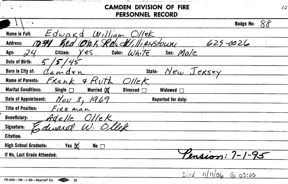 EDWARD W. OLLEK was born in Camden on May 5th, 1945 to Frank and Ruth Ollek. He was one of ten children. The Ollek family was living at 567 Van Hook Street when the 1947 Camden City Directory was compiled, and were still at that address in the fall of 1969. Edward Ollek married Adelle Laczynski in 1965. There were two children, Edward and Barbara. Edward Ollek was appointed to the Camden Fire Department on November 3, 1969 and remained on the force for over 25 years, retiring on July 1, 1995. When residency restrictions were removed from the Camden Fire Department, Edward Ollek moved to Williamstown, New Jersey. He was in business as the owner and operator of Ed's Carpet Center in Williamstown for many years. Edward Ollek passed way on November 10, 2006, and was buried at St. Joseph's Cemetery at Chews Landing. |