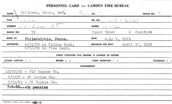 Edwin Callahan's career in public safety began on April 23, 1924 when he was appointed to the Camden Police Department. Two weeks short of four years later, on April 9, 1928 Edwin Callahan reported for duty at Ladder Company 4 at South 10th Street and Morgan Boulevard. His transfer by appointment was dated April 16, 1928. Department personnel records indicate that he was transferred to Engine Company 10 at the same location on December 28, 1928, however, Ladder 4 attendance records indicate that he was not transferred. When Ladder Company 4 was disbanded on July 5, 1936 Edwin Callahan was transferred to Engine Company 8 on Kaighn Avenue. His last transfer came on March 21, 1941, when he was sent to Engine Company 6 at Front and Linden Streets, near where he had grown up.