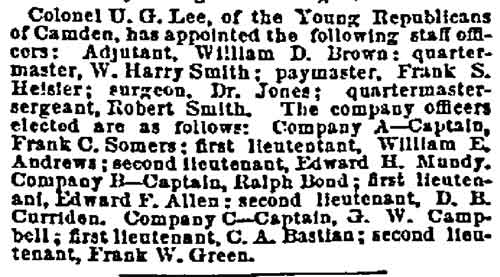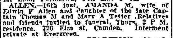 enlistment. A large number of the After completing his military service, Edwin F. Allen returned to his parents in Baltimore. By the spring of 1870 he was working as a tin can maker, according to the Census taken on June 29th of that year. He may also have gained some experience there as a volunteer fireman. Not long after the Census was taken, came to north to Camden, New Jersey and Edwin F. Allen married Amanda Fetter. Edwin F. Allen was living at or near North 5th and Market Streets, when, as stated above, on October 9, 1872 he was appointed as an extra man with the Hook and Ladder Company (present- day Ladder Company 1) of the Camden Fire Department as a replacement for david b. sparks, who had resigned. He served for almost nine months, tendering his resignation on June 30, 1873. The 1878 Camden City Directory shows Edwin Allen at 235 Hartman Street, which was renamed Clinton Street a few years later. He was then working and for a good number of years thereafter as a foreman at Abraham Anderson's canning factory. The Allen family was still at 235 Clinton Street in 1883. The City Directory for that year shows Edwin Allen as a foreman at the Anderson & Knowles factory, Abraham Anderson having by then taken on a partner. He was living at 412 Clinton Street when the 1884-1885 and 1885 Directories were compiled. The 1887 City Directory indicates that the family had moved to 554 Pine Street, and they were still there in 1888. The 1890 Veteran's Census gives Edwin Allen's address as 415 Line Street. The Allens moved to 426 North 7th Street around 1894 and were still at that address in 1900. The 1906 City Directory states that the Allens were at 223 North 10th Street, and that Edwin F. Allen's occupation was "superintendent". When the Census was taken in 1910, Edwin and Amanda Allen were living at 708 Birch Street in North Camden. Four of their five children were living, although none lived with their parents. The living children were James F. Allen, Julia Goldy Allen, Lee Goldy Allen, and Mary A. Allen. The Allens were still at 708 Birch Street as late as 1912. Edwin and Amanda Allen later moved to 726 Elm Street. This was their home when Amanda Allen died on June 16, 1913, survived by her husband and four children. Edwin F. Allen joined her on April 3, 1914. They both are buried at Evergreen Cemetery. Edwin F. Allen was a member of the General John A. Logan Post No. 102 of the Grand Army of the Republic, which met in East Camden in the 1900s. |