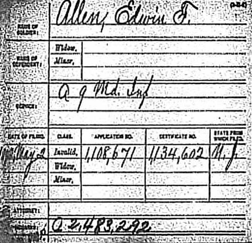 Edward Forrest Allen was born in Maryland in July of 1844 to James and Lucy Allen. His father was a shoemaker. Edwin Allen lived in Baltimore through the enumeration of the 1860 Census. He enlisted as a Private on June 19, 1863 in Company A, 9th Infantry Regiment Maryland. The Ninth Maryland Infantry, under the command of Colonel Benjamin L. Simpson was organized under the call of June 15, 1863, for emergency troops to repel the Confederate forces then invading Maryland and Pennsylvania, and was mustered into the United States service for a period of six months. It consisted of nine companies, eight of which were raised in the city of Baltimore and the other in Baltimore county. On July 6, 1863, before the organization was completed, the regiment left Baltimore and joined General French's division, which drove the Confederates from Maryland heights, after which it crossed the Potomac and occupied Loudoun Heights. Companies A, B and C were later engaged in guarding the Baltimore & Ohio Railroad and in doing guard duty at Harper's Ferry, and about the middle of August the remainder of the regiment was ordered to occupy Charlestown, West Virginia, where it was attacked on October 18 by the Confederates under General Imboden. Although the Ninth made a gallant stand it was overpowered by superior numbers and captured. Of the prisoners not more than one-half ever returned to their homes, the others dying in Southern prisons. Companies A, B and C remained on duty in Virginia until the expiration of their term of enlistment, and were mustered out at Baltimore on February 24, 1864. Private Allen was among these who mustered out of Company A, 9th Infantry Regiment Maryland on February 24, 1864 at Baltimore.