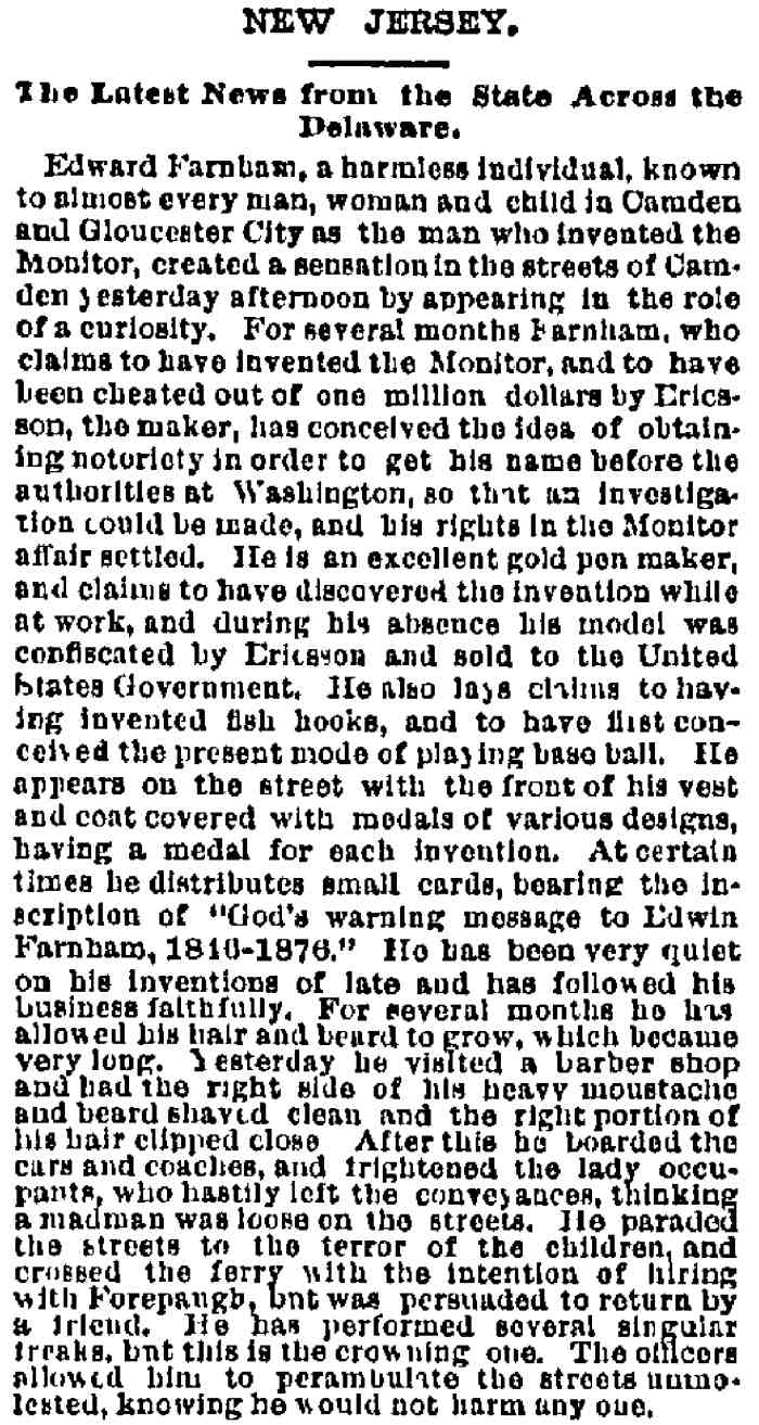 EDWIN FARNHAM was a somewhat eccentric character who lived in Camden in the 1880s and 1890s. He was born to Thomas Allen Farnham and his wife, the former Chloe Eliza Abbott, on May 17, 1846 in Hamton, Connecticut. Thomas Allen Farnham was a watchmaker, and by 1870 had moved his family to Gloucester Ciy, New Jersey. The Farnham family, whichincluded younger siblings Abbott, Frank, and Alice, was still in Gloucester City when the Census was taken in 1880. By this time Edwin Farnham was working as a gold penmaker, a trade he followed on and off throughout his life.