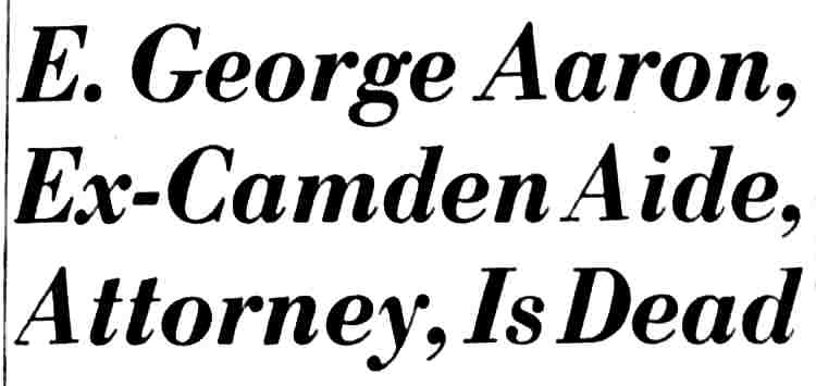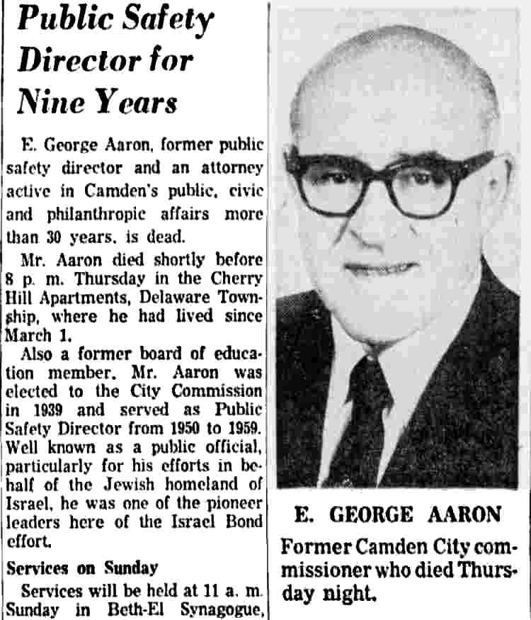 E GEORGE AARON was one of Camden's leading citizens during the 1930s, 1940s, and 1950s, serving on the school board, the City Commission, and as Director of Public Safety from October of 1949 until May of 1959. He took ill shortly after losing his bid for re-election to the City Commission in May of 1959 and passed away in May of 1960.