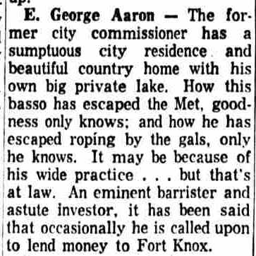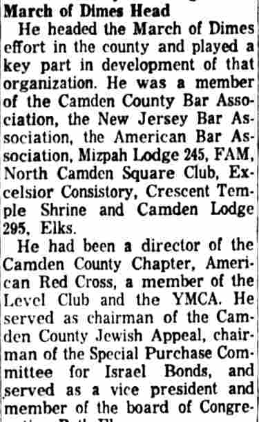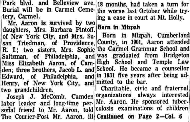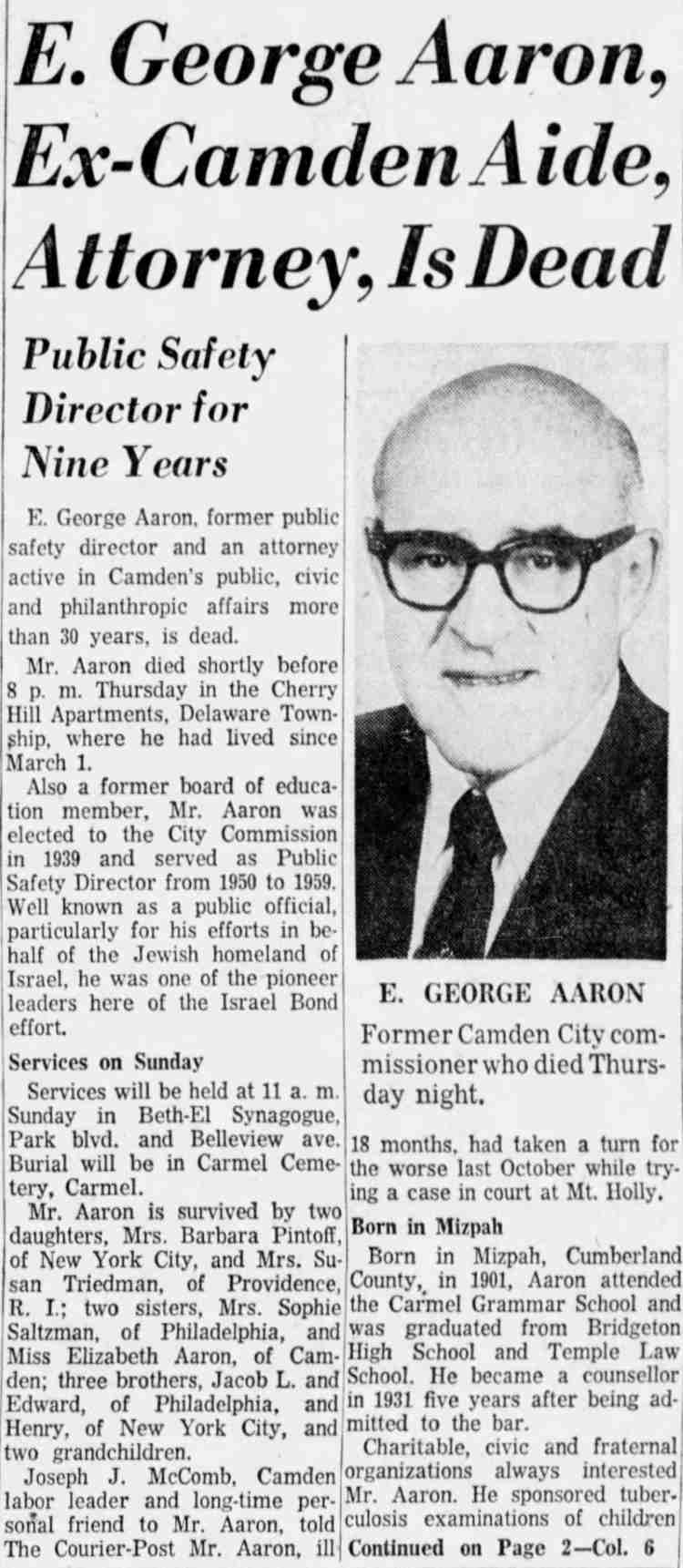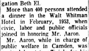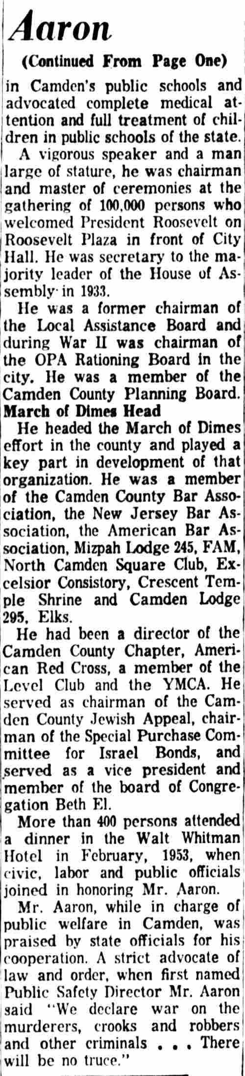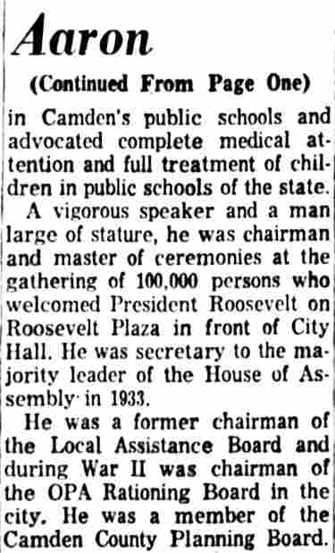 OCTOBER 20, 1939 Man About Town City Commissioner E. George Aaron observed his 37th birthday anniversary today. Unknown to George, this amateur historian again dug into the archives and we found that Aaron is the youngest man ever elected as a city commissioner in Our Town. We might also say that for a gentleman of such tender age E. George Aaron, citizen, lawyer, and city commissioner has made good use of his maturing years. We snooped into his record. Consistency is one of his many assets. The guy was born in Mizpah, Atlantic county. When he joined the Masons, Aaron signed up with Mizpah lodge. Admitted to the bar in 1926 Attorney Aaron didn't have his shingle out a week when he got his first case—defending a Bridgeton man who was indicted for murder. The young attorney had the indictment not prossed. On this natal day anniversary Commissioner Aaron will look back reflectively to the days when as boy he milked the cows and worked so on his father's farm. Unable to enlist in the Army during the World War when he was a stripling of 15 years he went to Springfield, Mass., where he helped to make rifles for the U.S. Army. Three of his brothers fought overseas. In turn he worked as an ambulance driver, Insurance salesman and theatre manager. Aaron studied law at nights, at Temple Law School. Proud of the religious faith of his forefathers, Commissioner Aaron is president of Beth El Synagogue and he usually is found heading up campaigns to help men, women and children of all creeds and faiths. His newest jobs are as chairman of the local assistance board and the Camden County Chapter of the Association for Infantile Paralysis, Inc. Happy birthday, Commissioner Aaron! |