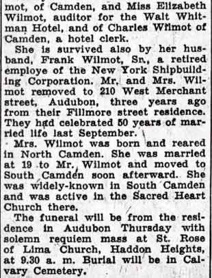 neighborhood. Around 1934 Mrs. Wilmot began to suffer from arthritis, and she and her husband moved shortly thereafter to Audubon NJ. Eleanor Jane Wilmot passed away on January 10, 1938. She was buried in Cavalry cemetery in what was then Delaware Township (present-day Cherry Hill) NJ. |