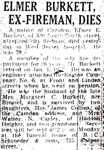 Descendants of James BURKETT Produced by Legacy on 23 Jun 2009 First Generation 1. James BURKETT was born about 1825 in PA and died between 1870 and 1874 in Camden, NJ.General Notes: In the 1874-75 Camden City Directory, Elizabeth was first listed as a widow. James was alive in the 1870 United States Federal Census, so he must have died between 1870 and 1874. James married Elizabeth COLBERT, daughter of William F. COLBERT and Sophia STEVENS. Elizabeth was born on 24 May 1829 in Philadelphia, PA, died on 5 Feb 1911 in Camden, NJ at age 81, and was buried in Camden, NJ, New Camden Cemetery. Children from this marriage were: M i. James BURKETT was born on 15 May 1850 in Camden, NJ, died on 3 Mar 1928 in Camden County Hospital (Lakeland), Gloucester, NJ at age 77, and was buried on 5 Mar 1928 in Potters Grave. James married a person whose name at this time is not known. James next married Emma JEITNER on 8 Dec 1888 in Camden, NJ, Union Methodist Episcopal Church. Emma was born in 1869.M ii. William BURKETT was born on 15 May 1850 in Camden, NJ, died on 13 Aug 1902 above Hollow Bridge, Bristol, PA at age 52, and was buried in Friends Cemetery. William married Margaret. Margaret was born in Nov 1859 in Pennsylvania. M iii. Charles BURKETT was born in 1852 in Camden, NJ, died on 20 Nov 1908 in Camden, NJ at age 56, and was buried in Old Camden Cemetery. Charles married Hannah UNKNOWN. Hannah was born in 1854 in New Jersey, died in Dec 1912 in Camden, NJ at age 58, and was buried on 14 Dec 1912 in New Camden Cemetery, Camden, NJ. M iv. Albert F. BURKETT was born in Dec 1854 in Camden, NJ, died on 24 Mar 1935 in Trenton, NJ at age 80, and was buried in Bristol Cemetery, Bristol, PA. Albert married Theresa R. GIBSON in 1876. Theresa was born on 18 Apr 1858 in Philadelphia, PA and died on 22 Jan 1938 in Beverly, NJ at age 79. F v. Clara L. BURKETT was born between 1857 and Jan 1858 in Camden, NJ, died on 22 Jan 1888 in Camden, NJ, and was buried in Camden, NJ, New Camden Cemetery. Clara married William John COLBECK on 3 Nov 1882 in Camden, NJ, Union Methodist Episcopal Church. William was born in 1849 in England. General Notes: 1. Sponsor for William and Clara at their marriage was George Burkett. F vi. Caroline S. BURKETT was born on 10 Oct 1858 in Camden, NJ, died on 23 Jan 1941 in Camden, NJ at age 82, and was buried in Jan 1941 in Harleigh Cemetery, Camden, NJ. Caroline married Thomas R. ELLIOTT about 1880. Thomas was born about 1857 in Scotland, died on 18 Apr 1929 in Camden, NJ about age 72, and was buried in Apr 1929 in Harleigh Cemetery, Camden, NJ. M vii. George C. BURKETT was born on 6 Nov 1861 in Camden, NJ, died on 19 Dec 1933 in Camden, NJ at age 72, and was buried on 22 Dec 1933 in New Camden Cemetery, Camden, NJ. General Notes: George lived at 1004 Lawrence Street, Camden and worked as a sawyer for Victor (that became RCA). George married Wilhemina P. MURRAY, daughter of Issac P. MURRAY and Ella. Wilhemina was born on 14 Feb 1870 in Camden, NJ, died in Oct 1940 in Camden, NJ at age 70, and was buried on 28 Oct 1940 in New Camden Cemetery, Camden, NJ. M viii. Ellsworth BURKETT was born between 1864 and 1865 in Camden, NJ. M ix. Elmer E. BURKETT was born in Sep 1865 in Camden, NJ, died in Mar 1945 in Camden, NJ at age 79, and was buried on 19 Mar 1945 in Locustwood Cemetery, Cherry Hill, NJ. Elmer married Margaret Cecelia BROSEL. Margaret was born about 1872 and died in 1939 about age 67. M x. Edward BURKETT was born in Dec 1867 in Camden, NJ. M xi. Daniel BURKETT was born about 1870 in Camden, NJ. It is more than likely that "Ellsworth Burkett" and E;lmer E. Burkett are the same person. |