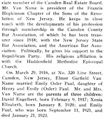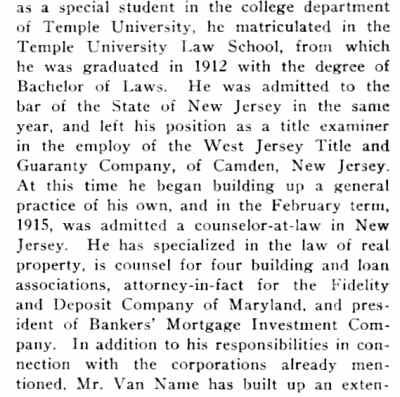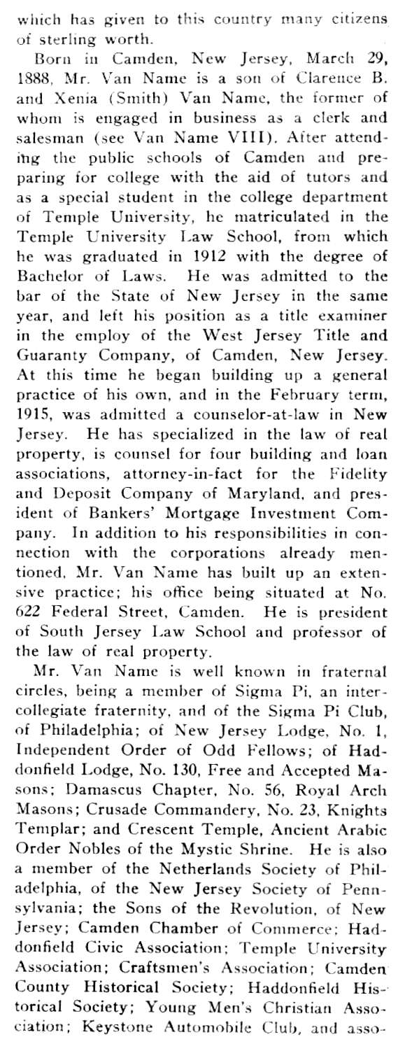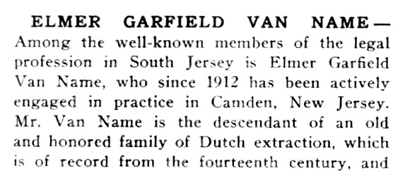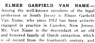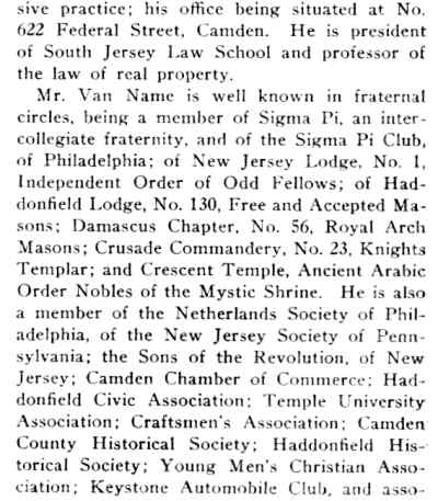 ELMER G. VAN NAME was for many years the president and dean of the South Jersey Law School, which over time evolved into the Rutgers Camden campus. |