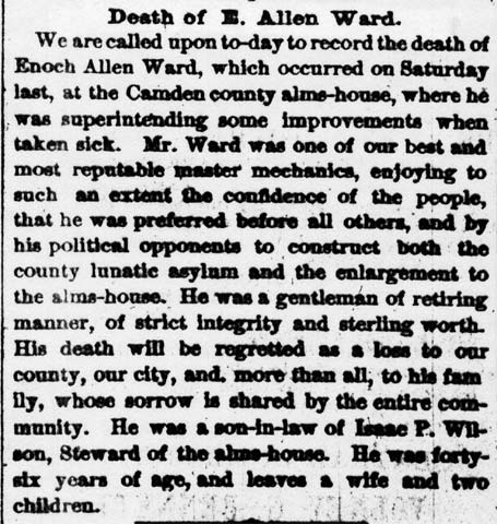 ENOCH ALLEN WARD was born June 26, 1831 to Mason and Hannah Barton Ward in what was then Newton Township, Gloucester County NJ. This location is presently within the borders of the City of Camden. He was the youngest of seventh of eight children, and interestingly enough, born between two brothers both born to Mason and Hannah Ward named Aaron. The first Aaron had been born in 1829 but died before his third birthday, and the youngest child, born in 1834, was also named Aaron Ward. By the time of the 1860 Census he had moved to Camden's North Ward, where he worked as a house carpenter. His widowed mother Hannah Ward then lived with him. She would move in with younger brother's Aaron's family after the Civil War. Generally known as E. Allen Ward, he married Emma Wilson on March 20, 1861. The marriage produced three children, of which at least two reached adulthood. In 1871 Jesse Starr donated 4 and 1/2 acres of land along Haddon Avenue on which to construct a new city hall for Camden. Designed by Camden architect Stephen Decatur Button, the contract was given to E. Allen Ward for the sum of $125,000. The building was completed in December of 1875, and became the seat of government for Camden the following year. During his lifetime, E. Allen Ward and family had made their home at 439 Berkeley Street. At the time of the 1880 Census they were living at 517 Clinton Street. Daughter Annie W., 17, and son Allie M. Ward, 14, were then living at home. In 1880 E. Allen Ward was given another government contract, this time to make improvements at the Camden County complex at Lakeland, in Gloucester Township. He was to build the County's first lunatic asylum, and enlarge the county almshouse. His father-in-law, Isaac Wilson, was then Steward of the almshouse. While working on this project, he contracted "typhus fever" and died in January of 1881. His wife and children lived at 513 North 4th Street in the late 1880s and early 1890s. E. Allen Ward was buried at Colestown Cemetery in Delaware Township (present-day Cherry Hill) NJ. Younger brother Aaron Ward was also well known in Camden for many years as a contractor. Concentrating on roads, bridges, and other public improvements, he built the first bridge across the Cooper River at Baird Avenue in 1903, and he also built another at Kaighn Avenue to cross the river, then known as Cooper's Creek. Aaron Ward also built a concrete wharf at the foot of Cooper Street that was utilized for many decades, and in South Camden Aaron Ward's firm built the Line Ditch sewer. Niece Lettie Allen Ward, after teaching until her 30s, became a physician in 1897, gaining distinction as being one of Camden's first female doctors. She lived and practiced general medicine at 704 Broadway, and later at 325 Cooper Street, also specializing in ailments of the ear, nose, and throat. |