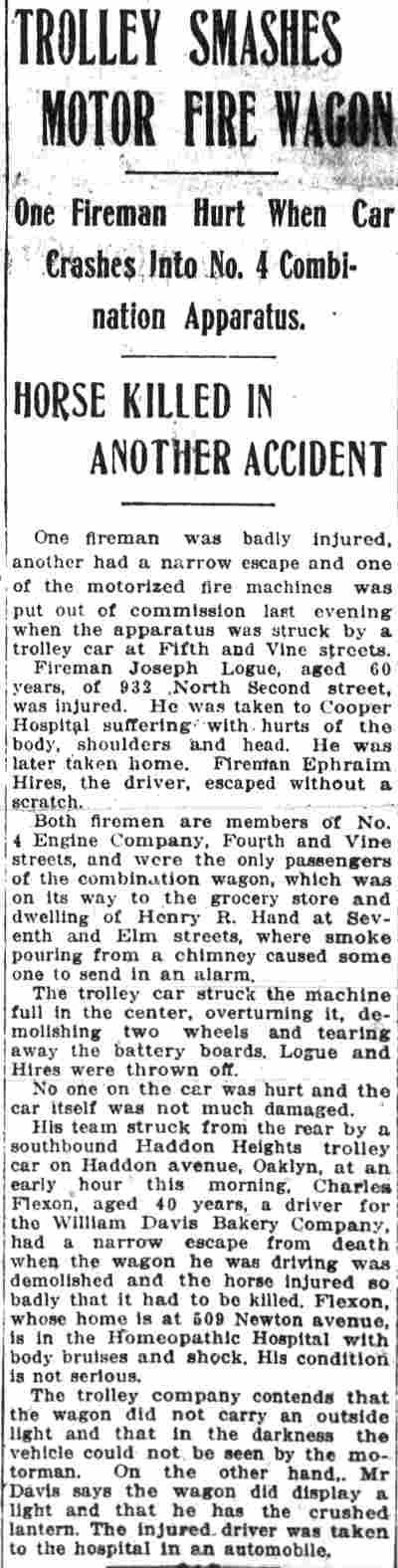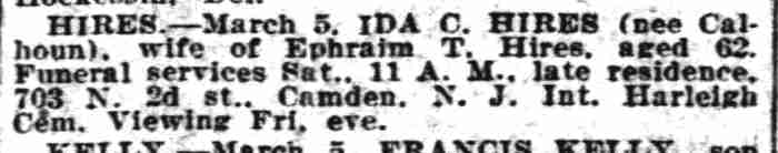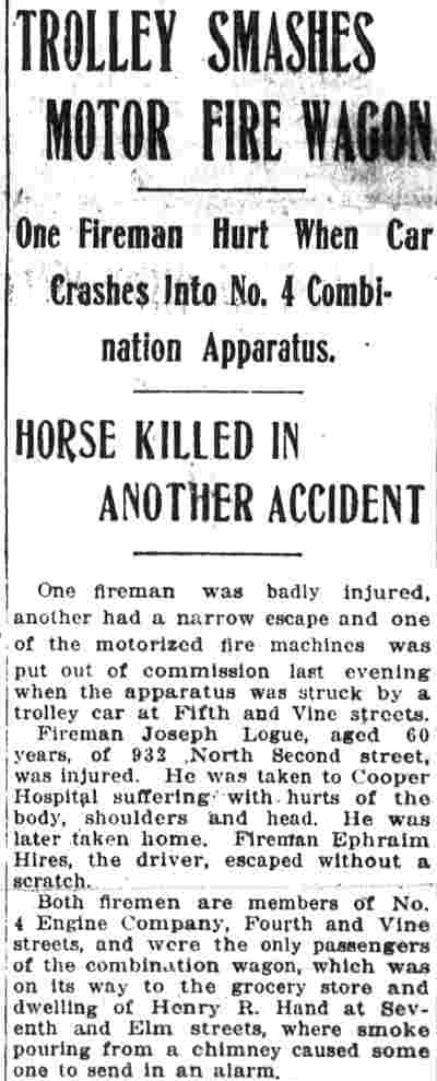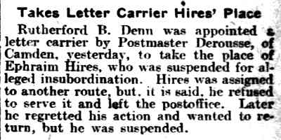 EPHRAIM T. HIRES was born on July 11, 1865 to Daniel and Sarah Hires in Upper Alloways Creek, New Jersey. His father was a farmer. The family came to Camden in the 1870s. The 1874 City Directory shows a Daniel Hires, butter dealer at 445 South 5th Street. This may or may not be Ephraim T. Hires' family. Daniel Hires and family were established in Camden by 1877. That year's directory shows a business, D. Hires & Company, butchers at 222 Market Street. Daniel Hires' home was given as 166 North 3rd Street. City Directories and Census records have Daniel Hires and family at 106 North 2nd Street from 1878 to 1883 City Directory, same address. By 1884 the family had moved to 61 North 2nd Street. Daniel Hires was still working as a butcher, Sarah Hires kept a boarding house at that address. Ephraim Hires begins appearing in City Directories, working as a plumber, a trade he followed until at least 1891. Still living with his parents, Ephraim Hires was listed at 215 North Front Street. He was working as a plumber for former Camden County sheriff William Calhoun in 1888. The 1890 City Directory lists Ephraim Hires at 210 Friends Avenue, working as a plumber for William Calhoun. He also began a relationship with Calhoun's daughter, Ida. William Calhoun was very prominent in local politics. He had served on City Council, was with Camden's water works for seven years in the 1870, was Camden County Sheriff from 1878 to 1881, and was on the Board of Education in the 1880s. He also for a short time was the co-owner with Jacob C. Daubman of the Camden County Courier, a weekly newspaper which they sold in September of 1881 to Francis Ford Patterson. This newspaper began publishing as a daily in June of 1882 and continues today as the Courier-Post. By July of 1891 William Calhoun had helped Ephraim Hires secure a job as a letter carrier. Ephraim Hires worked as a letter carrier in Camden as early as 1891. The 1892 City Directory has him living at 304 Market Street. His address from 1895 through 1897 was the West Jersey Hotel at Delaware avenue and Market Street. On April 29, 1898 Ephraim Hires married Ida Calhoun. The couple lived at 105 Penn Street in 1898 and 1999. Ephraim and Ida Hires were living at 122 State Street when the 1900 Census was taken. Also living with them were Ida's parents, William and Rebecca Calhoun. A dispute over a work assignment seems to have cost Ephraim Hires his job with the postal service in January of 1903. City Directories from 1903 through 1906 show him living at 134 Cooper Street and working as a janitor. His father-in-law, William Calhoun, passed away in 1905. He is not listed in the 1907 Camden City Directory. Ephraim T. Hires was appointed to the Camden Fire Department on November 27, 1907. Directories from 1908 through 1911 and the 1910 Census shows Ephraim and Ida Hires at 124 State Street. Mother-in-law Rebecca Calhoun was also living with them at that address. Directories from 1913 through 1918 indicate a move to 908 North 3rd Street. By the end of 1919 Ephraim and Ida Hires and Rebecca Calhoun had moved to 702 North 2nd Street. Ida Hires died on March 5, 1924 and was buried at Harleigh Cemetery. Rebecca Calhoun also passed away that year. The 1926 Camden City Directory shows that Ephraim Hires was still working for the Camden Fire Department. He passed away that year and was buried at Harleigh Cemetery. The circumstances if his demise are not known, however it was not considered a line of duty death at the time. |