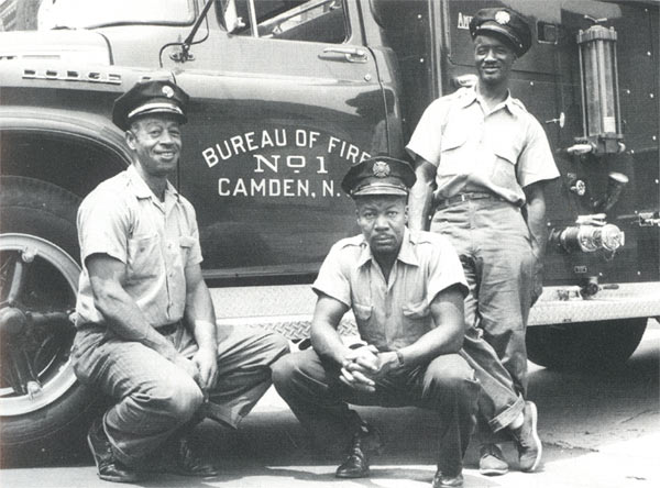 Circa 1949- Engine Company 1, wagon and pumper at front of quarters, South 4th & Pine Streets, South Camden. From left: Firemen Alfred Green, Fred Henderson, Charles Cook, Leroy Hatchett, Robert Thomas, Andrew Robinson, James Richardson, Eugene Alston, James Clinton, Captains Jesse Jones and Raymond Amos. |