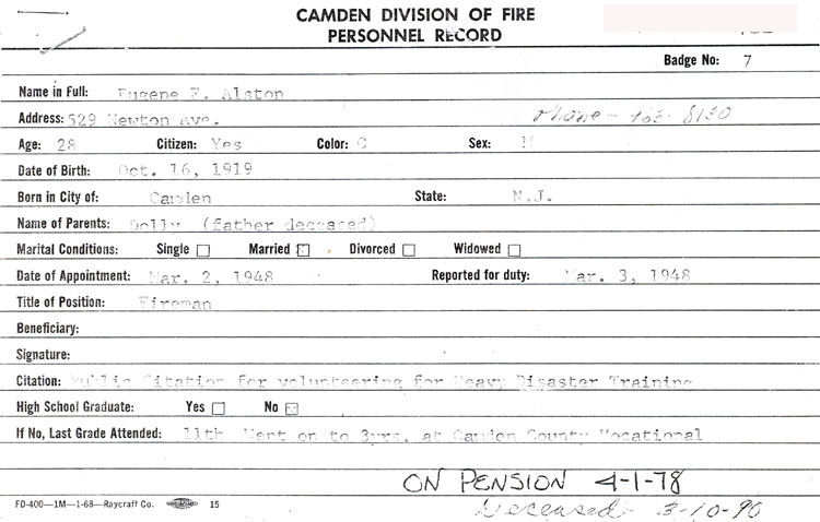 EUGENE F. ALSTON was born October 16, 1919 in Camden to Richard Alston and his wife, the former Dolly Robinson. His father had been born in 1891 in Henderson, North Carolina. Richard Alston was working as a laborer at the Victor Talking Machine Company in June of 1917, and had married. Mr. and Mrs. Alston then lived in Camden at 1017 Francis Street, a small street that ran south from Walnut to Chestnut Street, between Front and South 2nd Streets. When the Census was taken in 1920, the family, which included an older sister Priscilla, lived at 1005 Francis Street. The Alstons shared the home with Dolly Alston's brother, Richard Robinson, and his family, at the time of the 1920 Census enumeration. Both Richard Alston and his brother-in-law worked as laborers at that time. The Alston family remained on francis street through 1929. By 1930 Richard Alston had found work at the nearby Public Service coke plant at the foot of Chestnut Street. He was still employed there in the spring of 1942. By that time Richard and Dolly Alston had moved to 1057 South 2nd Street. He died a few years later Eugene F. Alston attended high school through the 11th grade and then went to Camden County Vocational School. When the 1947 Camden City Directory was compiled, Eugene Alston had married and was living with his wife Mattie at 277 Clement T. Branch Village, a public housing project that had opened up in 1940. His sister Priscilla lived nearby at 255 Branch Village. Eugene F. Alston was appointed to the Camden Fire Department on March 2, 1948 and was assigned to Engine Company 1 at South 4th and Pine Streets. During his career with the fire department he received a public citation for volunteering for special disaster training. The 1956 New Jersey Bell Telephone Directory shows Eugene F. Alston had moved to 241 Branch Village . By October of 1959 he had moved to 1137 South 9th Street, and by 1970 to 529 Newton Avenue. On March 31, 1970 Fireman Alston was slightly injured while fighting a fire at the General Radio Supply building at North 6th and Penn Streets. Eugene F. Alston retired after 30 years service on April 1, 1978. A lifelong resident of Camden, Eugene Alston passed away on March 10, 1990. |