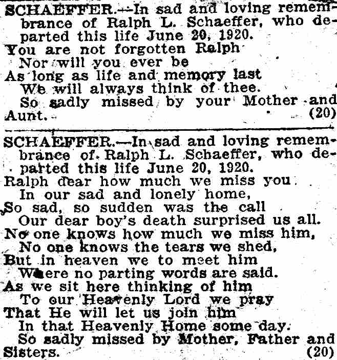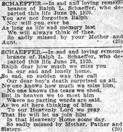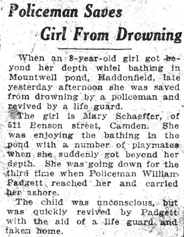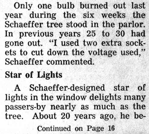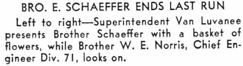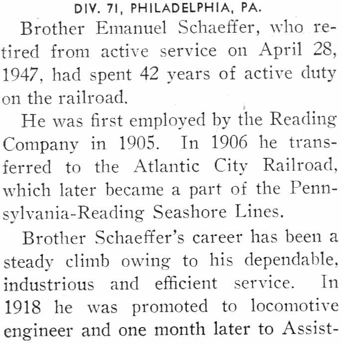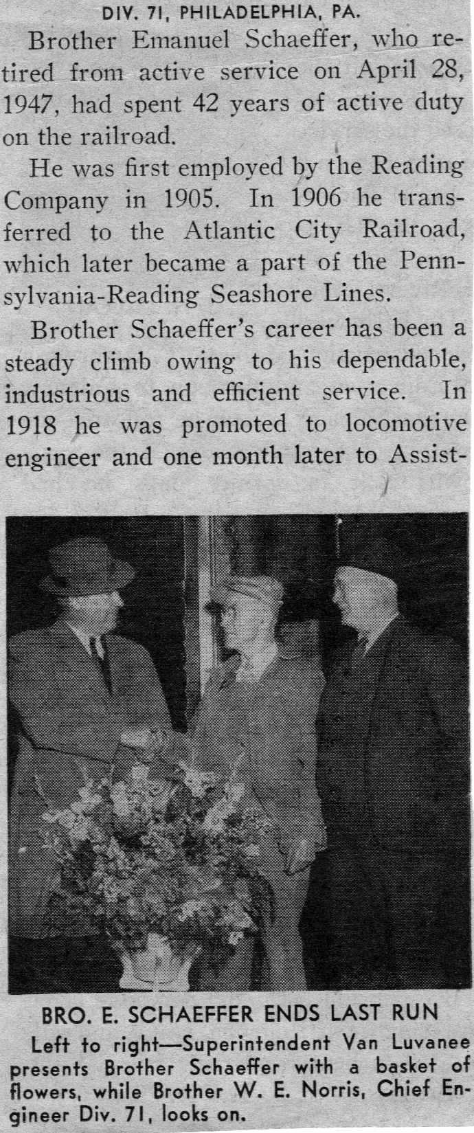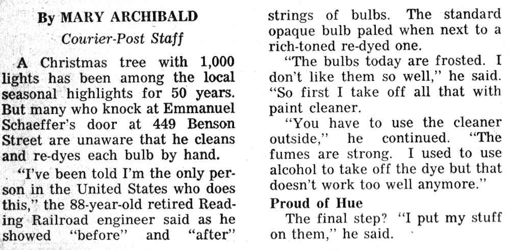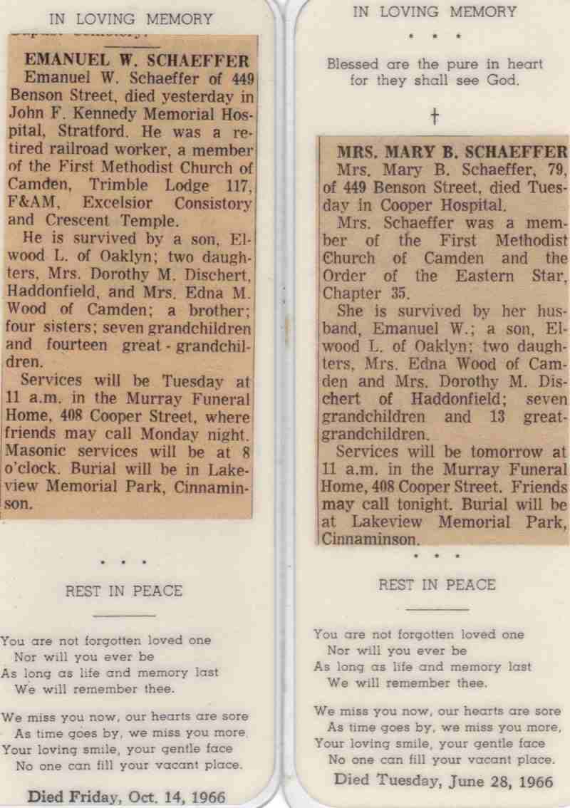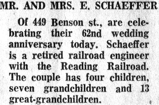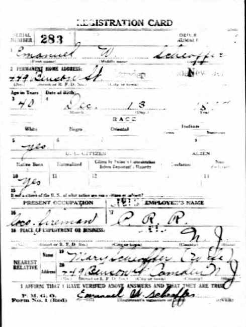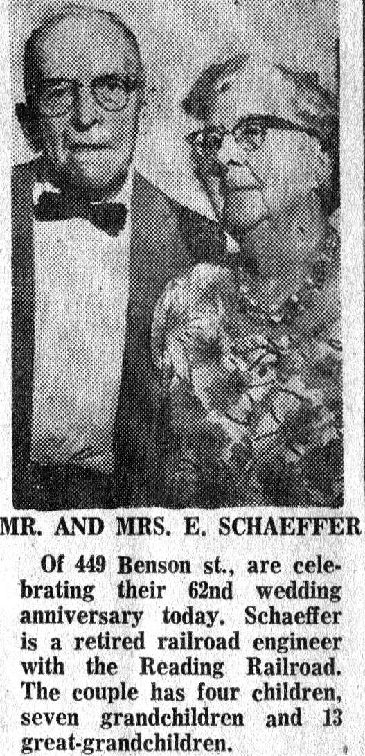 EMMANUEL WASHINGTON SCHAEFFER was born in Rock, Pennsylvania in 1877. By 1902 he had come to Camden, New Jersey. In that year he married Mary Bartlett Williams. City Directories for 1903 show him at 209 Mickle Street, and at 211 Mickle Street when daughter Edna May was born. In 1905 he began working for the Reading Railroad. The following year he transferred to the Atlantic City Railroad, which in the 1930s became the Pennsylvania-Reading-Seashore line. The family moved to 320 Mickle Street in 1906, the year that son Ralph was born. They sayed at this address through 1910. The 1911 City Directory shows the Scheffers at 412 Mickle Street, and they are listed at 414 Mickle from 1912 through 1917. By September of 1918 Emmanuel and Mary Schaeffer moved to 449 Benson Street, where they would live out their days. Two other children were born, Dorothy and Elwood, sadly, oldest so Ralph died in June of 1920. Working his way through the ranks at the railroad, Emmanuel Schaeffer worked until 1947 as an engineer. He retired on April 28, 1947 after 42 years of service. Locally, he was well known in his neighborhood for his Christmas display, which featured hand painted lights. His display was featured in the Christmas Eve edition of the Courier-Post in 1965. Mary Schaeffer passed away in July of 1966, and Emmanel joined her in October of that year. |