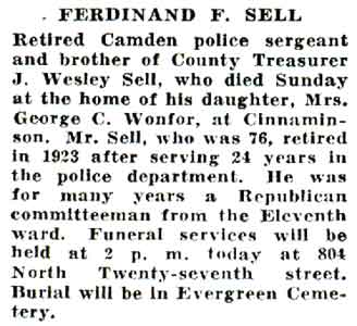 At the time of the 1920 Census he was living with his wife Margaret and father-in-law George Harris at 2721 Sherman Avenue in the Cramer Hill section of Camden. Ferdinand Sell retired in 1923, after 24 years of service, with the rank of sergeant.