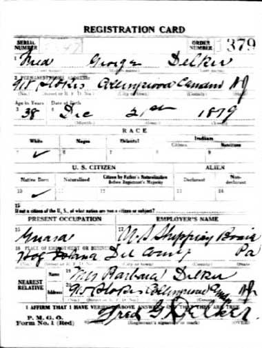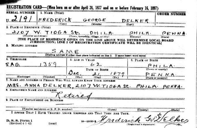 FREDERICK GEORGE DELKER was born on December 21, 1879 in Philadelphia to Fred J. and Barbara Delker. When the Census was taken in 1880 the family lived at 3349 Market Street, the elder Delker then working as a pharmacist. There were four older children at home at that time, Thomas Gertie, Emma, and Sadie. The Mr. and Mrs. Delker were both German-born, and had come to Philadelphia from Schulkill County PA, where they were living in 1870. F. George Delker came to the Camden area and was known as a prizefighter for a time. He was associated with the Camden Public Safety Committee during World War I, and served with the Home Guards. By 1942 F. George Delker had retired and was living in Philadelphia. |