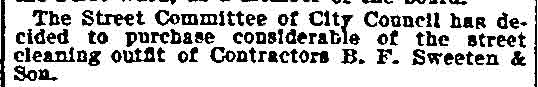 Among these were bridges in Camden, Crum Creek, Pennsylvania; Pocomoke City, Mary1and, and in Cape May County, New Jersey, some of which are still doing service. They also did considerable road-building in South Jersey. In the work of more recent years may be mentioned: One million dollars' worth of sewer construction in the city of Baltimore, Maryland; many miles of sewers and street paving in the city of Camden; the entire water and sewer systems in Avalon, New Jersey; entire sewer system m Millville, New Jersey; sewers in New Brunswick, New Jersey; Quakertown trolley line in Quakertown, Pennsylvania; electric railway in Ocean City, New Jersey; paved between tracks of the Camden, Gloucester & Woodbury Railroad Company. For seventeen consecutive years, the concern removed ashes and garbage and cleaned the streets of the city of Camden, ending in 1904.