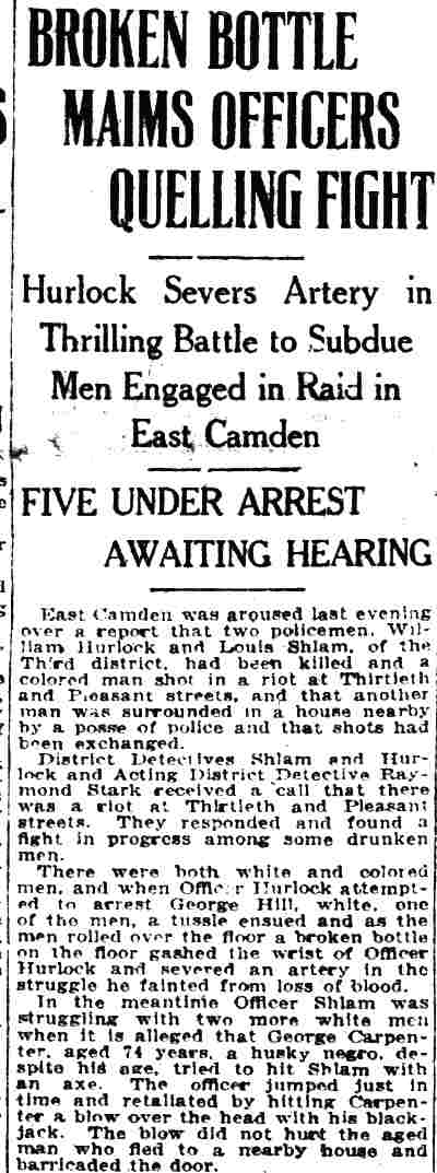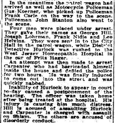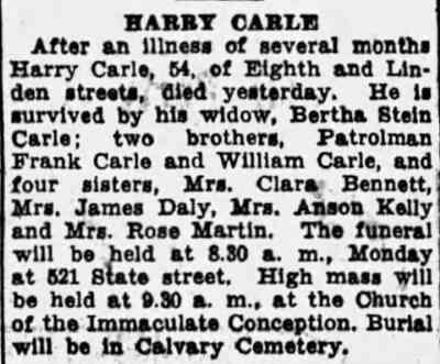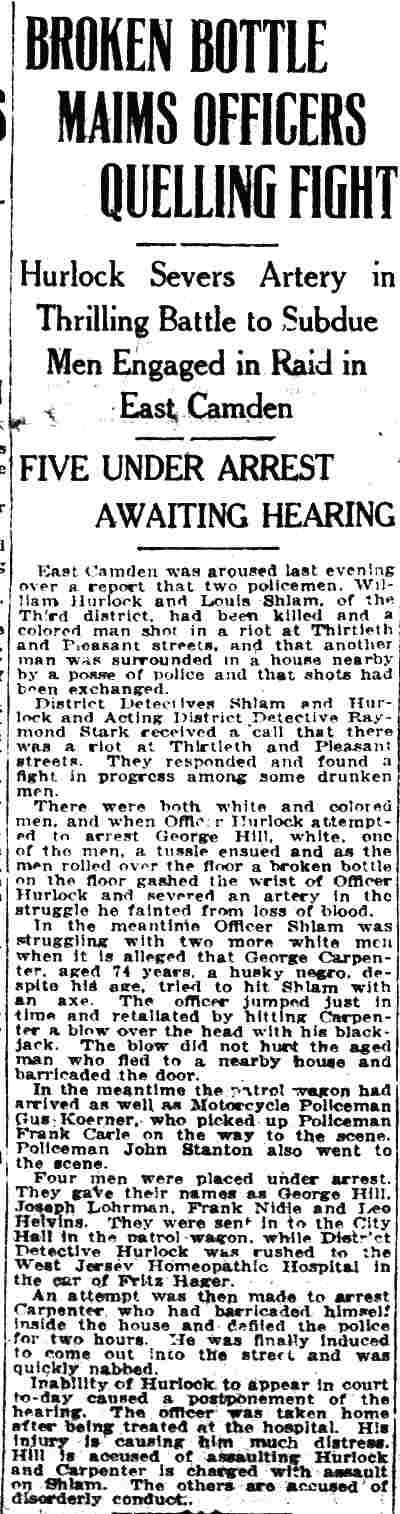FRANK C. CARLE appears to have been born in Bridgeton NJ around 1878 to William and Lizzie Carle. In 1921 he became a member of the Camden Police Department. At the time of the 1930 Census, he made his home at the corner of 339 North Eighth, the corner of North Eighth and Linden Streets. His mother, brother William, and sister Elizabeth lived around the corner, at 728 Linden Street, Elizabeth being the wife of James J. Daly, who owned and operated Daly's Cafe at 800 Linden Street. Another sister, Mrs. Mary Kelley, lived at 333 North Eighth, and two other sisters, Mrs. Rose Martin and Mrs. Clara Bennett, lived in the area. The 1930 census states that Frank Carle was living with his wife Lillian, a nephew, Clarence Barnes, and also rented rooms to two boarders. Frank C. Carle served as a member of the Camden Police Department until stricken by a paralyzing disease (a stroke, polio or ALS) on October 15, 1940. He applied for his disability pension on November 30, after 19 years and three months on the force. Officer Carle passed away on December 3, 1940. He was buried at Calvary Cemetery in what was then Delaware Township (present day Cherry Hill) NJ. He was survived by his widow, Mrs. Hannah Carle, his mother, brother, and sisters. |