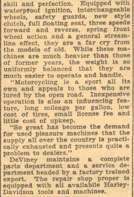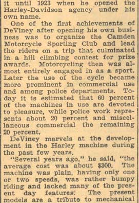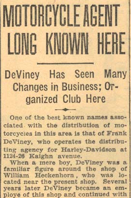 FRANK DE VINEY was born in Camden around 1900 to Elwood and Bessie Deviney. His fathers family originally had been from Burlington County. The 1910 Census shows the DeViney family living at 734 Pearl Street. Motorcycles arrived in Camden about the same time automobiles did, and were quite popular. Frank DeViney was fascinated by them as a boy, and spent much of his free time at the shop of William Heckenhorn, who had a Harley-Davidson motorcycle dealership at 1246 Haddon Avenue. Frank DeViney eventually was hired by William Heckenhorn. He married around 1920. In 1923 Frank DeViney opened a Harley dealership of his own, the successor to William Heckenhorn's operation, at 1124-1126 Kaighn Avenue, where he had a sales, parts, and service operation. He sold motorcycles to the general public and to local police departments. Frank and Myrtle DeViney also lived at 1124 Avenue Kaighn when the 1930 Census was enumerated. One of Frank DeViney's first acts upon opening his business was to found the Camden Motorcycle Sporting Club, which engaged in touring, racing, and hill-climbing events throughout South Jersey and eastern Pennsylvania. The club also fielded a team in the Eastern Motorpolo League, which competed in the sport of motorcycle polo, also known as motoball. Frank DeViney participated in the sport in 1929, but is not listed as a player in any of the news articles discovered to date. Other players on the Camden Motorcycle Sporting Club's team included Bill Gommel, Walter Norris, William Raub, Bruce Saunders, Lou Ellis, Charley Ellis, Clayton Albertson, Freddy Galardi, Walt Norris, C. Wentzel, Freddie Gomba, and men only known by their last names: Garriardi, Sherttuck, Oilinger, L. Lewis. Clayton Albertson also operated a motorcycle dealership in Camden. Frank DeViney was still in the motorcycle business in Camden as late as May of 1934. By 1947 he had left Camden. His wife Myrtle G. DeViney passed away at the age of 96 in May of 1998. She last had been a resident of Forked River NJ. |