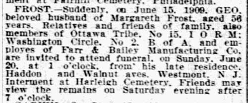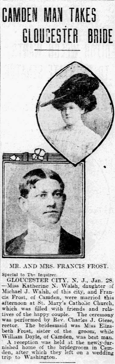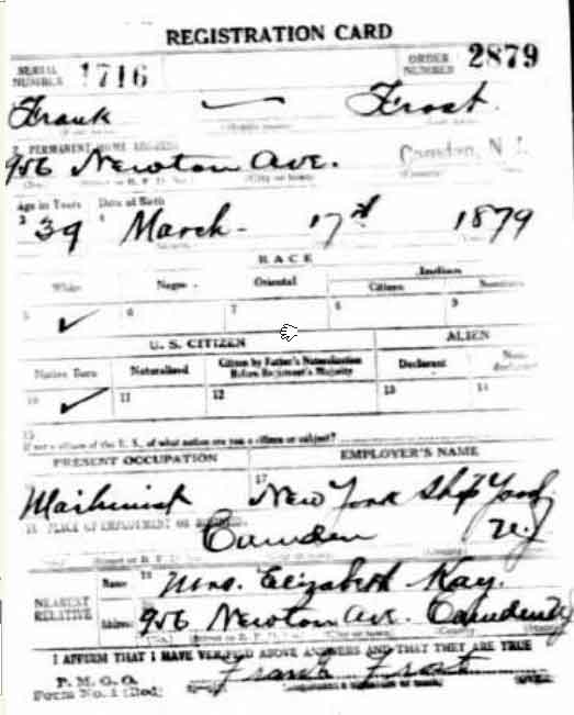 FRANK FROST was born in Camden, New Jersey on March 17, 1879 to George Frost and the former Margaret Smith. His family had come to Camden in the mid-1850s and were quite active in civic and business affairs in the young city of Camden. George Frost was the son of Andrew and Christiana Frost, both of whom were born in what is now Germany. The family name was originally Fraust, and his parents and siblings went by that name into the 1870s. Not long after the birth of George Frost's older brother Henry in 1839 his parents came to the United States with with him and his older brother William. They first settled in Pennsylvania, where a thirds son, Charles Frost, was born around 1843. Two more sons came to the Frost family, Frederick in 1848 and Lewis in 1852, before the family came to New Jersey, where, in May of 1853, George Frost, was born. When the 1860 Census was taken, the Frost family lived in Camden's South Ward, and another son, Franklin, had recently been born, and Edward would come in May of 1863. Andrew Frost worked as a tailor to support his family. The three oldest sons were working at the time of the 1860 Census. Henry Frost, then 21, was working as a blacksmith, brother William sold cigars, and brother Charles, then 17, was an apprentice at a coach works. George Frost was living with his parents and brothers Lewis, Frank, and Edward when the census was taken in 1870. He and Lewis were working as iron moulders. Older brother Henry Frost was appointed to the Camden Fire Department as a replacement for J. Kelly Brown, who had resigned from service as an extra man with Engine Company 2, on October 9, 1872. Henry Frost was a blacksmith by trade. He was living at 112 Taylor Avenue during his time in service with the Camden Fire Department. Henry Frost was dismissed from his position on July 15, 1873 along with Bernard Dennis and Thomas Grapevine. This ended his involvement with the Camden Fire Department.
