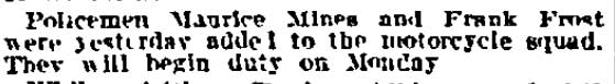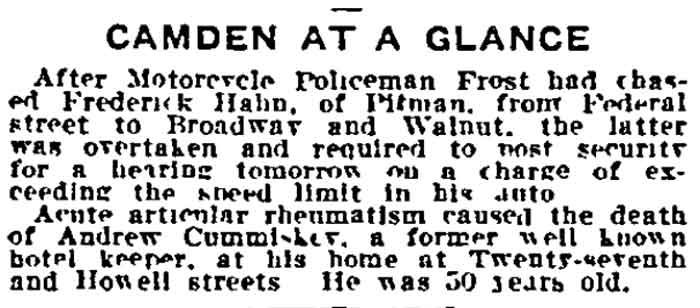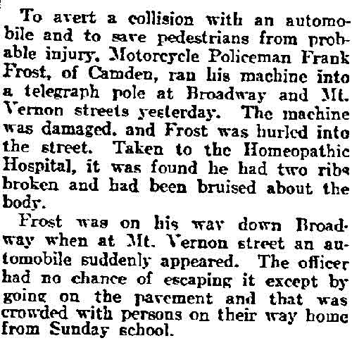 making his home at 509 Division Street when initially appointed. Shortly after being reappointed in April of 1879, George Frost moved to 517 Division Street. The 1880 Census lists George and Margaret "Maggie" Schmitt Frost at 517 Division Street with their two sons, Lewis, 2, and Frank Frost, 1. The family was back at 509 Division Street in 1881, then moved to 1026 broadway, where they remained through at least 1885. A daughter, Elizabeth would be born in 1884. As he was an extra man with the Fire Department, George Frost listed his occupation as oilcloth printer. George Frost served with the Fire Department until April of 1882, when he was not re-appointed. He spent most of his remaining working days working in the oil cloth industry, for the Farr & Bailey Manufacturing Company. By the spring of 1885 George Frost and family had moved to 1026 Broadway. The 1900 Census states that the Frost family lived at 1020 broadway, and that George Frost was working as a color mixer at an oil cloth factory. Son Lewis would follow him into this trade. George Frost was still at 1020 broadway when the 1906 Camden City Directory was compiled. Shortly afterwards, he moved to Westmont, New Jersey. Frank Frost married Catherine Walsh in January of 1904. The young couple moved into a fully furnished home at 1023 Spruce Street, next door to his brother, Lewis, who lived at 1025 Spruce Street. George Frost died suddenly, on June 15, 1909 and was buried at Harleigh Cemetery. His older brother Charles had also died unexpectedly in 1904. He and his family had been members of Ss. Peter & Paul Catholic Church on Spruce Street in Camden. Younger sister Elizabeth married Lloyd D. Kay shortly after the 1910 Census was enumerated. Frank and Catherine Frost were childless when the 1910 Census was taken. They were living at 1023 Spruce Street in South Camden. Brother Lewis Frost, his wife Bertha and daughter Hazel lived next door at 1025 Spruce Street. Lewis Frost and his family moved to New Brunswick, New Jersey during the 1910s. Frank Frost is listed in the 1916 City Directory at 1023 Spruce Street, with his wife Catherine and working for the police department. His widowed mother, sister Elizabeth and brother-in-law Lloyd Kay were living at 956 Newton Avenue. By the time the 1917 Directory was compiled, Catherine Frost may have passed away, or the couple may have separated. Frank Frost was still working as a motorcycle policeman in Camden as late as March of 1917. He was treated for an abscess on his neck in July of that year, and moved in with his mother and sister at 956 Newton Avenue. Frank Frost resigned from the police department to take a job at one of Camden's shipyards in January of 1918. Frank Frost was living at 956 Newton Avenue and working as machinist at the New York Shipbuilding Company shipyard when he registered for the draft in September of 1918. The 1918-1919 Camden City Directory shows him working as a clerk and living at the same address. Frank Frost does not appear in the 1920 Census or the 1920 City Directory, or any Camden directories thereafter. Frank Frost apparently left Camden and New Jersey altogether. By February of 1920 he had moved to Los Angeles, California. He later went to California, where his sister Elizabeth and her husband, Lloyd Kay, had gone to in the late 1910s. Frank Frost passed away in Los Angeles, California on January 18, 1940. He was survived by his sister, her husband and a nephew. As stated above, Frank Frost's father and his uncle, Henry Frost, had both served as members of the Camden Fire Department in the early 1870s. An uncle through marriage, William Turner, was also a Camden Fire department member for two years in the early 1880s. Frank Frost's older brother, Lewis Frost, was well known in Camden at the turn of the century as a member of the Century Wheelmen athletic club. As stated above, he worked as a color mixer and moved out of Camden during the 1910s Frank Frost's cousin, George W. Frost, the son of his uncle Frederick Frost, had a long career with the Camden Police Department, retiring as Chief of Police in the late 1940s. Another uncle, Charles A. Frost, was a successful businessman and a co-founder of what was generally known as Jenning's Sixth Regiment Band, which became something of a Camden institution for many years. |
