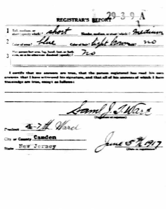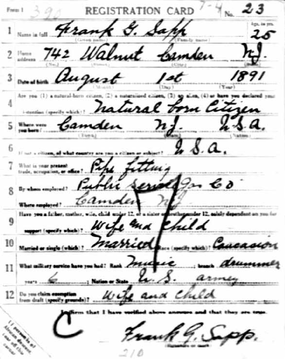 FRANKLIN GAUNT SAPP was born in Camden, New Jersey on August 1, 1895 to Frank G. and Nellie Sapp. He was the third child, coming after daughters Eva and Nellie. When the Census was taken in 1900 the family lived at 1032 South 4th Street. His father was then working as a teamster in a lumber yard. The 1906 City Directory shows the family at 317 Sycamore Street. By 1910 Frank Sapp's sister Nellie had married James Curran. Frank Sapp, his parents and sister Eva lived with the Currans at 707 Walnut Street. The Sapp family had moved to 206 Walnut Street by the summer of 1913. When he registered for the draft on June 5, 1917 Frank G. Sapp had married Anna Mary Goldy. He was then working as a pipefitter for the Public Service Gas Company. Frank G. Sapp was living with his wife and child at 742 Walnut Street. He was still at that address in the latter half of 1918. The