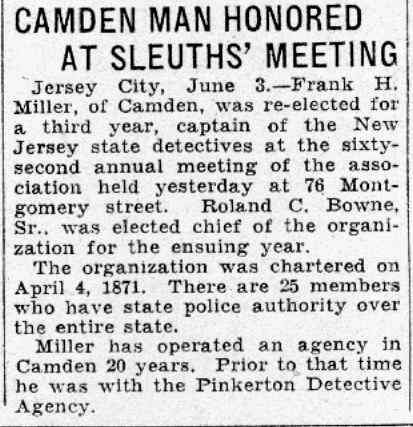 N. J. SLEUTHS RE-ELECT FRANK MILLER CAPTAIN Frank H. Miller, 443 Broadway, yesterday was re-elected captain of state detectives at a meeting of the New Jersey State Detective Association at Jersey City. R. C. Bowne, Trenton, was re-elected chief and Walter S. Le Tourneau, Jersey City, secretary. Miller is beginning his sixth term as captain. His is the oldest agency in Camden and reports that the association showed that in 22 years existence he has lost only three cases. |