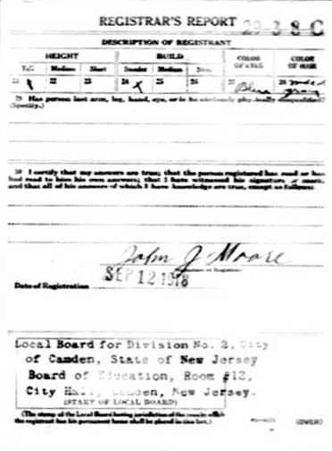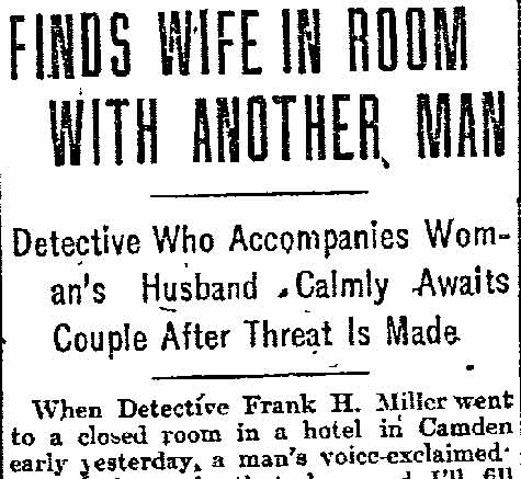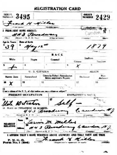 FRANK H. MILLER founded his detective agency at 443 Broadway in 1912. The business was operated by him and a son William H. Miller at that address through at least 1947. The agency apparently was sold by 1956. The new owners operated at 578 Clinton Street as late as 1959. Frank Miller was born in New Jersey on May 12, 1879. The 1910 Census shows him working as an investigator, living at 911 Cherry Street with his wife of 12 years, Mildred. The 1920 Census shows him living at 443 Broadway with his wife named Teresa, daughter Dorothy, and niece Martha MacIntire. The 1930 Census shows that he had moved to 919 Merrick Street in Haddon Township, and that his wife was named Catherine. By 1947 a William H. Miller was running the business. |