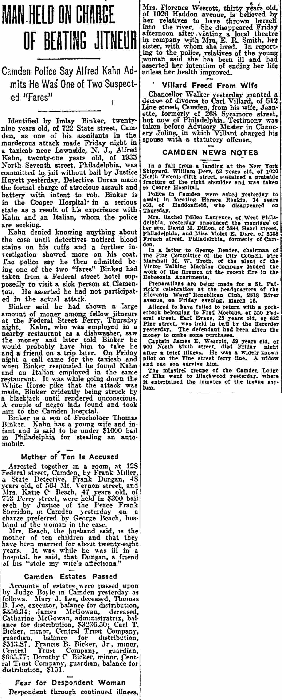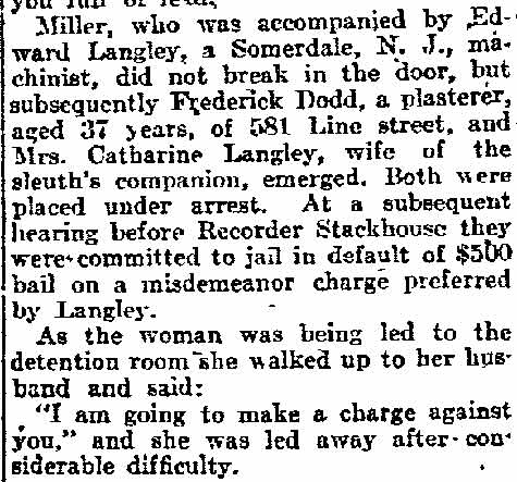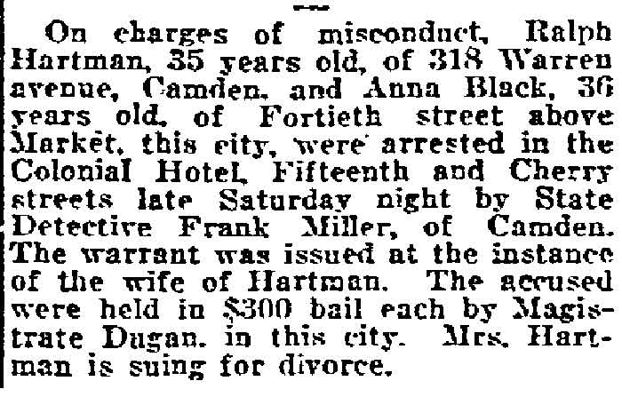 ARRESTED AFTER 24 HOUR VIGIL Arrested last night as they left an apartment at 727 Penn street, Rayfield Hartman, 38, of that address, and Mrs. Jean Everett, 35, of 111 East Franklin Avenue. Collingswood, were held in $300 bail on statutory charges by Justice of the Peace Frank Sheridan. The couple was arrested by Detective Frank Miller, who had kept a watch on the apartment for 24 hours, at the request of the woman's estranged husband, Harry Everett, formerly of Euclid Avenue, now of Montgomeryville, Pa. Hartman and Mrs. Everett first were arraigned before Sheridan in the Federal building. Both had been drinking, according to Sheridan, and Hartman attempted to hit Miller. Sounds of the fight reached post office employees downstairs and they ran upstairs with drawn pistols, believing a holdup in progress. Sheridan committed the couple to the county jail until they became quiet, when the hearing was held at Sheridan's home, 941 Elm Street. Two months ago Mrs. Everett was fined $200 for drunken driving in Gloucester, and in 1930 she was fined $75 for possession of liquor after a raid on her home by Chief of County Detectives Lawrence T. Doran. |