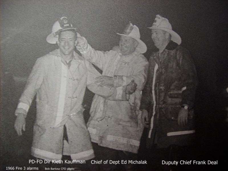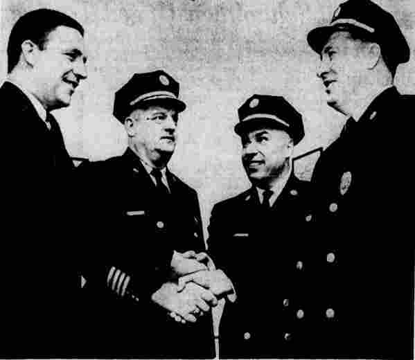 July 1, 1965- On the occasion of Edward Michalak's appointment to Chief of Department (seated from left) retiring Chief of Department Edward MacDowell , Chief Edward Michalak, Director Keith Kauffman; (standing from left) District Chiefs Frank Deal, Joseph Guarino, Robert Dukes, Anthony Saponare, Theodore Primas, Daniel Jiannetto, Fireman Erwin Brennan, Major William Gwynne of the Volunteers of America Fire Canteen. |