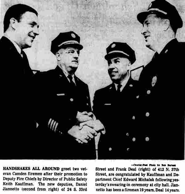 Courier-Post HANDSHAKES ALL AROUND greet two veteran Camden firemen after their promotion to Deputy Fire Chiefs by Director of Public Safety Keith Kauffman. The new deputies, Daniel Jiannetto (second from right) of 24 South 33rd Street and Frank Deal (right) of 412 North 37th Street, are congratulated by Kauffman and Department Chief Edward Michalak following yesterday's swearing-in ceremony at city hall. Jianetto has been a fireman 19 years, Deal 14 years. |