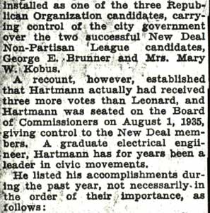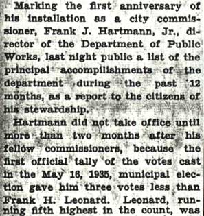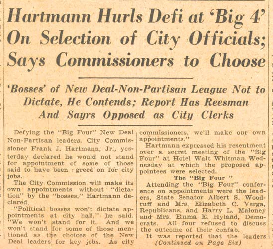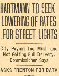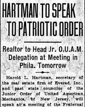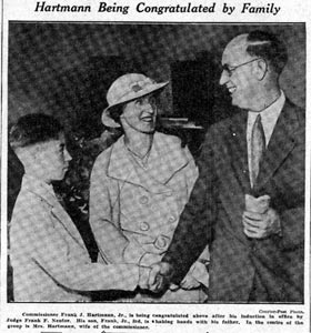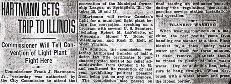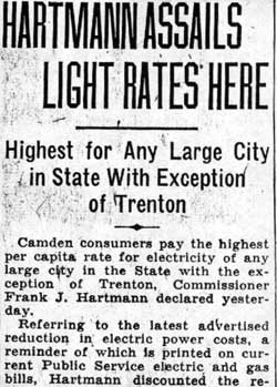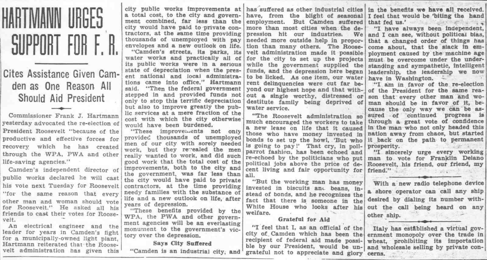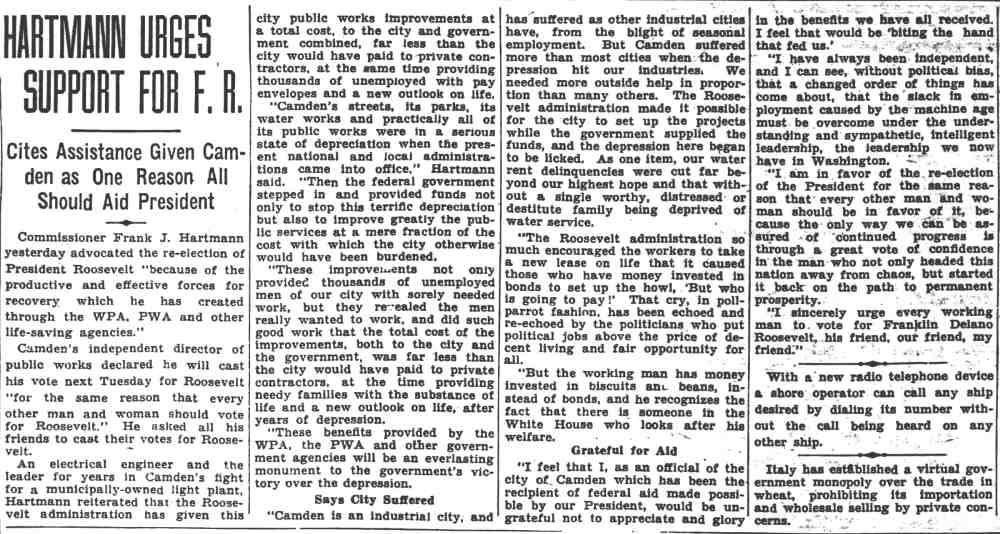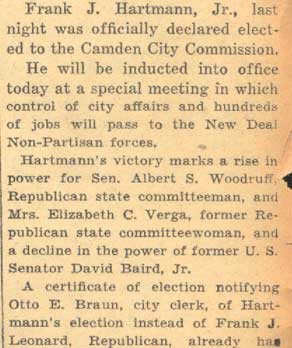 FRANK J. HARTMANN JR. was born in Camden NJ on November 3, 1898 to Frank J. Hartmann Sr. and his wife Anna. His father had emigrated to Camden from Germany around 1865. The Hartmann family lived in Cramer Hill onCleveland Avenue near Griffee Avenue before the turn of the century. By 1920 Frank Hartmann Sr. had purchased a home at 740 State Street in North Camden. and had established a successful cigar business for many years. Trained as an electrician, Frank J. Hartmann Jr., like his father before him, took an active role in the affairs of city. He was elected to the City Commission in the May 1935 election, his win, however, was not certified until after a recount, where he won by seven votes. He took his place on the Commission on August 1, 1935, and was appointed Director of Public Works. Initially aligned with Mayor George Brunner and his New Deal Democrat organization, Frank J. Hartmann Jr. soon split with Brunner, and lost his bid for reelection to the City Commission in 1939. Frank Hartmann Jr.'s term in office was noted by his efforts to control expenditures and reduce spending at the Department of Public Works. This made him few friends in local political circles, as he let many politically connected workers go, and alienated certain powerful business interests. He was a staunch advocate of Camden building its own municipal electrical plant. Although Camden voters voted twice for this improvement, it did not come to pass. He supervised the beautification of Roosevelt Plaza in front of City Hall, and hired Daniel G. Deacon to tend to the extensive flower beds set up with help from the Works Progress Administration. Frank J. Hartmann Jr. returned to private business after leaving the City Commission. His son, Frank J. Hartmann III was killed in action while serving with the Army in France on July 18, 1944. Frank J. Hartmann Jr. moved from Camden to Haddon Heights in the 1950s. He spent his later years in Cape May NJ, where he died in June of 1987. Frank Hartmann Jr. was a member of Mozart Lodge No. 121, Free and Accepted Masons. He was elected to a one-year term as the lodge's Master in 1933. |