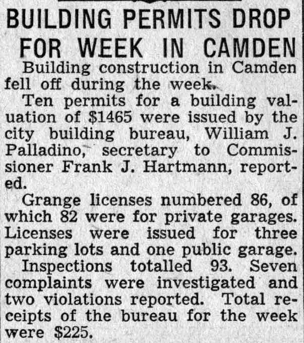Building in Camden showed an increase last week, Commissioner Frank J. Hartmann, director of Public Works, reports. According to the Commissioner, the increase is taken by him to indicate that with the approach of Spring the city will have a still greater increase in building. During the week 20 building permits for an estimated value of $22,185, were issued. Receipts from licenses totaled $46.50. Licenses were issued for 43 private garages and one auto repair shop. Trade licenses numbered eight. Bureau receipts for the week ending yesterday amounted to $229.50. Inspectors of the bureau made 140 inspections, investigated 24 complaints and reported eight violations. William J. Palladino, personal secretary to Hartmann and chief of the building bureau, reported contractors and builders are cooperating with the new rule requiring blueprints or acceptable hand drawn graphs of building plans. Bureau inspectors under Hartmann's direction are checking all dilapidated houses and buildings for the purpose of ridding the city of dangerous structures which contribute to fire hazards.