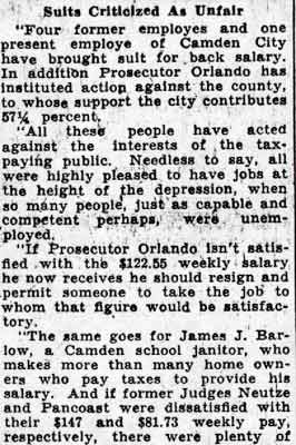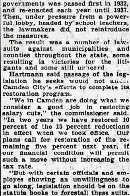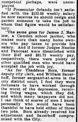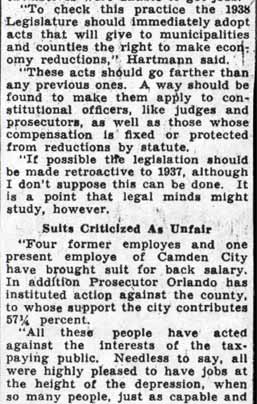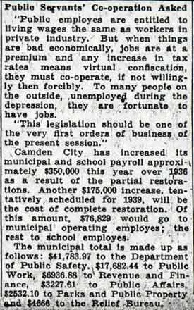 BUDGET SLASH SEEN IN UNIFIED OFFICES Merger of Surrogate, Registrar and County Clerk Posts Advised by Burnison James W. Burnison, chairman of the Joint Taxation Committee's executive committee, yesterday sent a letter to Dr. W. Carleton Harris, city-county financial adviser, making several recommendations in the hope of maintaining or even reducing the county tax rate. Pointing out that if the county budget is adopted on first reading tonight only a 10 percent change can be made later in the tax levy, Burnison urged that the committee's suggestions be acted upon at once. Among the recommendations were these: 1. Consolidation of the offices of county clerk, register of deeds and surrogate to prevent a $14,000 loss incurred by the first two named offices and even show a profit. 2. County should ask the city to bid on maintenance of both the city and county buildings, as Commissioner Frank J. Hartmann had stated the city could do so at a saving of at least $40,000. 3. A thorough survey of jobs and salaries. Two pay increases were cited and questioned by Burnison, as examples. Burnison's letter, which also compliments Dr. Harris for discovering an unnecessary $45,000 road item in the budget, follows: Too Late for Full Study "We received a copy of the proposed 1938 budget for Camden County too late to make the study of it that is necessary for intelligent recommendations for savings prior to its introduction, after which time a change of only ten percent can be made in each item. We are therefore hastening to bring to your attention certain matters which we have previously taken up with the freeholders in former years that may offer the savings necessary for preventing an increase in the 1938 tax rate or making an actual decrease possible. "We commend you for detecting the road item amounting to $45,000, which you brought to the public's attention this morning. "Last year Commissioner Frank J. Hartmann of the City of Cam-den, made a statement that he could operate the City Hall and Courthouse at a tremendous saving over the $122,111 which the county is asking for 1938. In our opinion the cursory examination of the operating expenses of the Courthouse showed that material savings could be made. We know for instance that in the Courthouse operating expenses an allowance is made for an electrician at $1800, and an electrician's helper at $1500. On the other hand we notice that for all of the institutions at Lakeland there is only an allowance of $1620 for an electrician and $1500 for an electrician's helper. Suggests City Make Bid "This is but one of the many items that a more careful study of the 1938 budget would disclose in connection with courthouse operation. "Why doesn't the county ask the city to make a bid for operating and maintaining the city hall and courthouse for 1938? From our understanding of Commissioner Hartmann's statement last year, the city would propose to do this at a saving of not less than $40,000 under the figure which the county is asking. This item alone would be nearly enough to prevent an increase in the county's tax rate, and combined with the $45,000 that you, have found in the highway fund, would make a decrease possible.