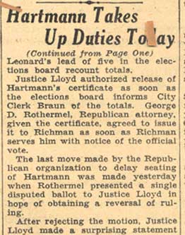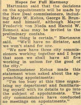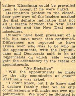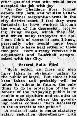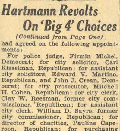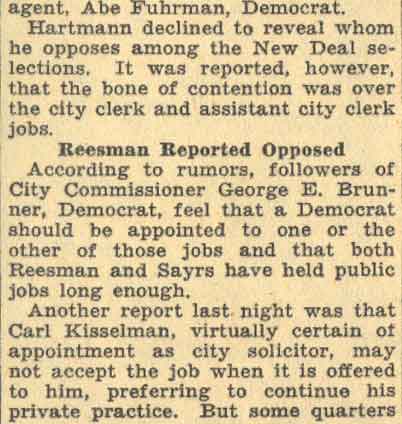 SAMKO The hiring of Pete Samko, secretary of the Eighth Ward Democratic Club, as a $1380-a-year clerk in the health bureau, was announced yesterday by City Commissioner E. George Aaron. He replaces Frederick Scheurman, of 2969 Hartford road, former Fourteenth ward Republican committeeman. Commissioner Henry Magin announced the hiring of 16 temporary laborers for the Water and Highway departments which come under his Department of Public Works to The jobs, Magin said, are all replacements for persons who have been dismissed since he took office. He explained that 102 have been laid off during the period and 66, including yesterday's hiring, put on to replace them. Three of the 16 will be assigned to the water bureau, Magin said, and the others to the highway department. Those hired for the former department and their salaries are: James McSparrin, 939 Elm street, $1690 annually; Oscar Banks, of 1704 Master Street, $5 a day, and Lawrence DiPilla, of 229 Mt. Vernon street, $4 a day. The others given jobs at $4 a day are: Frank Armstrong, of 2617 Cramer street; Thomas I . Cook, of 530 north front street; albert costanzo, of 211 Beckett street; Roberto Dianigi, of 607 North Front street; Samuel Lectino, of 421 Stevens street; Joseph Lynskey, of 643 Grant street; William Porter, of 436 Berkley street and Thomas Richter, of 423 Pearl street, David Schwartz, of 812 South Sixth street; Fred Seither, of 3015 River avenue; Albert Thompson, of 421 North Front street; Guiseppe Trulli, of 550 South Fourth street, and Michael Wozniak, of 1446 South Tenth street. Hired, Replaced Employment of two new laborers and reinstatement of two others was announced Wednesday by Commissioner Magin. Three employees who worked under former Commissioner Frank J. Hartmann were dismissed. The pay of all was $4 per day. The new men are George Poole, of 276 Senate street, and William Weidman, 1041 North Thirty-fourth. Reinstated were James Jackson, 1117 Lawrence, and Otis Still, 261 North Eleventh. Those let out were Eugene Gatti, 208 Washington;Julio Marcozzi, 321 Line, and George Pollard, 336 Stevens. |