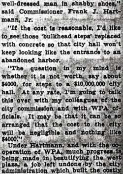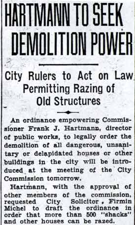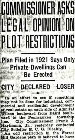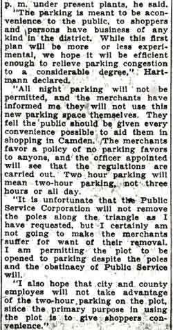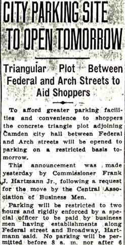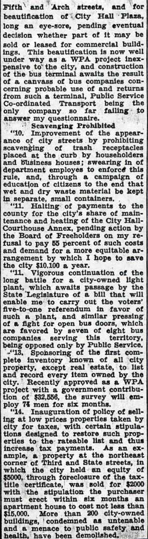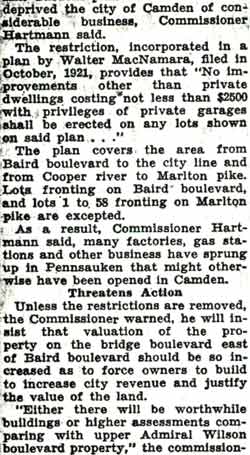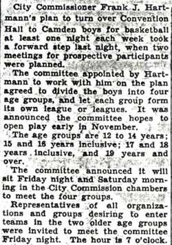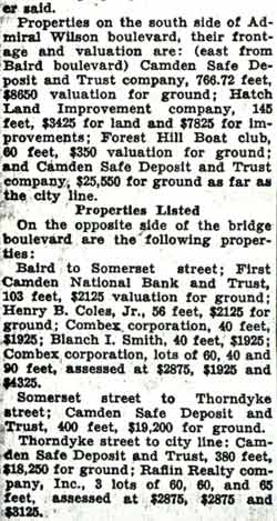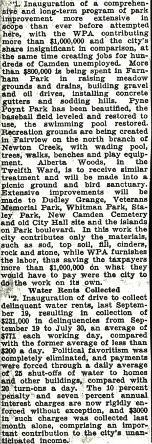 Bathing The Camden police were criticized yesterday at a meeting of the City Commission for relaxing their vigilance in halting damage by vandals in vacant properties which have caused total losses of $500,000 in the city. A committee representing the North Camden Civic Association appeared before the City Commission and urged an intensive campaign to halt destruction of unoccupied buildings. Among the committee's recommendations for the drive were greater activity by the police, co-operation by citizens with the police in reporting vandalism, appointment of special officers to watch the buildings and a general educational campaign in the city schools. Given Hot Clue Mayor Roy R. Stewart estimated that $500,000 damage had been done to vacant properties, and agreed to give full support to the drive to halt vandalism. With characteristic suddenness, Frank J. Hartmann, secretary of the civic association, arose in the meet ing and told the mayor that if policemen were sent immediately to Tenth and State Streets they would find young men engaged in tearing down an unoccupied factory. As another evidence of "police negligence," he said, young men and boys could be found bathing nude at that moment in Cooper River in that vicinity. Acting immediately, Mayor Stewart instructed Capt. John W. Golden, acting police chief, to send policemen to the neighborhood. 14 Nude Bathers Nabbed A few minutes later, 14 boys and young men, ranging, in age from 12 to 26, were arrested for bathing without clothes. All bathers over 14 were held in cash security of $10 and those under 14 were released in custody of their parents on charges of disorderly conduct. They are: Leslie Bayne, 26, of 503 Royden street; Harvey Howell, 16, of 529 Washington Street; John Grady; 19, of 578 Benson Street; Roscoe Davis, 15, of 253 North Eleventh Street; James Evans, 15, of 601 North Second Street; William Dempsey, 12, of 1030 Lawrence Street; Robert Farland, 13, of 1112 Federal Street; Roland Garber, 15, of 537 Birch street; Edgar Grundlock, 15, of' 318 North Tenth Street; Frank Garwood; 13; of 717 Bailey Street; Eugene Dodelin, 13, of 309 Cole Street; Ralph Skill, 13, of 512 North Seventh Street; Robert Rudd, 15, of 642 Linwood Street, and Richard Evans, 14 of 601 North Second Street. Miss Elsie Stein, a member of the committee, handed the mayor a letter from a woman who complained about young men bathing in Cooper River. The letter was turned over to Acting Chief Golden. "If the police performed the duties they are paid to perform, this vandalism could be stopped," Miss Stein said. Mrs. Stephen Pfeil, another committee member, told the mayor she realized the depleted condition of the police force and offered to aid in the educational campaign by talking against vandalism to children in the schools. Hartmann urged that politicians and public officeholders refrain from using their influence to obtain leniency for children guilty of damaging vacant houses. William Coghlan said he had complained to the police about the practice but had seen no results. Weed Cleanup Ordered Other members, of the committee presenting the protest were Vincent Martinelli and Leon Wojtkowiak, representing the South Camden Civic Association . The city commission adopted on final reading an ordinance requiring property owners to remove from the front of their properties and sidewalks weds and debris. A fine may be imposed as penalty for violation of the ordinance. A resolution was passed protesting an increase in power authorized by the federal government to Station WORC and WEPS, of Worcester, Mass. An increase to 1280 kilocycles and to 500 watts causes interference in broadcasting, from WCAM, the resolution pointed out. Assessors Reappointed Wilbur B. Ellis, Edward F. Peard and Thomas C. Wright were reappointed to the city board of assessors as of July 1. George H. Simpson, of 2725 Concord Avenue, was reappointed constable for three years in the Eleventh Ward. Another resolution was adopted by the commission clarifying to the federal government its position relative to responsibility as· to operation of WCAM. It was pointed out in the resolution that the mayor and city clerk had entered a supplemental agreement with the Broadcast Advertising Company, which leases the station from Camden. The government desired to establish that nothing be construed in the agreement which would relieve Camden from responsibility in operation of the station. Another measure adopted adjourns the city commission until July 13 for a hearing in proposed condemnation proceedings against properties at 332 and 334 Benson street, designated as fire hazards. |
