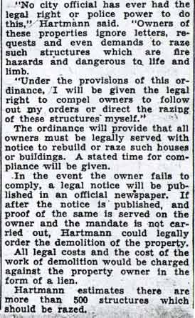 owners, vacant properties have been so destroyed Demands Punishment "We are going to ask that police apprehend these boys in an intensive campaign,. and we will insist that those found guilty be punished and their parents made responsible for the damage. Parents must be made responsible to break up this wanton destruction of property. We are aware that political interference may be encountered in such arrests, but we will vigorously insist that there be neither fish nor flesh in these arrests, but all punished commensurately with their deeds."