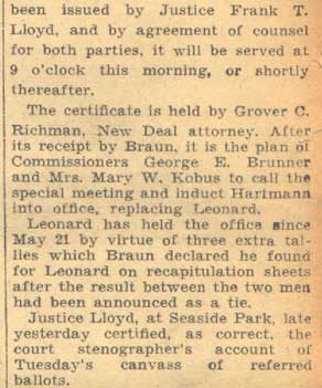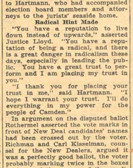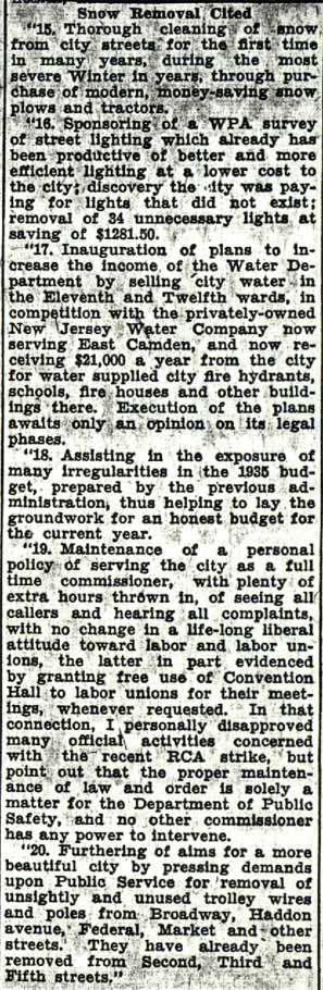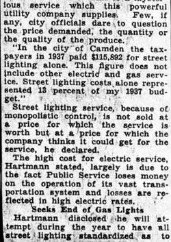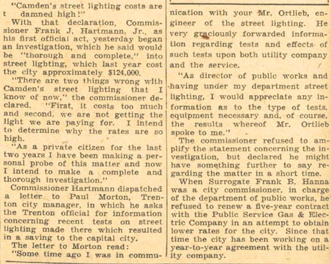 Charged Court action to force the Camden County Emergency Relief Administration to reveal its books for public inspection is planned by the Congress of Civic Associations of South Jersey. This was announced last night at a meeting of the North Camden Civic Association in the headquarters of the Pyne Poynt Social Club, 939 North Fifth street. Frank J. Hartmann, Jr., secretary of both organizations, disclosed the proposed step. Affidavits charging irregularities in the relief administration are being gathered, hartmann asserted. Wayland P. C ramer , director of the county relief board and Captain Albert S. Howard, deputy director, were charged with evading public inquiries. 'Fathers Fired-Girls Hired' "They've given us a grand run-a-round," hartmann said in relating his efforts in behalf of a destitute family. The Congress of Civic Associations, headed by Fred von Nieda, is determined to force inspection of the relief records by applying for a court writ, hartmann said, Vince Marinelli, member of the North Camden association and active in the Civic Congress, declared a number of married men were discharged from positions in the relief administration and single women engaged for their posts. Protest Rally June 11 The association agreed to join with the Unemployed Union of New Jersey in staging a public mass meeting to protest against the relief board. The meeting is scheduled for June 11, at the Convention Hall. Clarence E. Moullette, executive secretary of the unemployed group, addressed last night's session, which two score persons attended. 'Only 8 In 25,600 Rejected' hartmann declared that of Camden's' 117,000 persons, 25,600 are receiving emergency relief. The figure in the county is comparable, he said. Quoting Dr. Arthur L. Stone , who recently resigned as city director of emergency relief, Hartmann asserted 6828 of the 11,400 city's colored are in the relief line. "In all these cases the great Emergency Relief Administration has found only eight this year that were not worthy of receiving aid," hartmann said he was informed. "The taxpayers are paying the bills and they have every right to know how the money is being spent. "If Director c ramer and Captain Howard can be out of their office all day without anyone knowing where they are I think there is ground for investigation," he insisted. Cites Backyard Fires hartmann reviewed the plight of 11 families on State Street who were forced to cook meals over a backyard fire last Saturday after gas and electric service had been suspended for non-payment of bills. Thirty-five children were affected. hartmann estimated that Public Service could produce electricity to supply the apartment house for one month at a cost of $2. The charge is $22, he said. hartmann described advantages of a municipal electric plant, for which more than 11,000 persons have signed petitions circulated by the association and civic congress. He compared this city's tax rate and assessments with those of Jacksonville, Fla., and said the southern city earn-ed $2,000,000 profit from its municipal light and power plant in 1932. A campaign to further sentiment in favor of the municipal plant idea is being advanced daily, Hartmann reported. A staff of speakers is being enrolled. Dr. Stone's Work Reviewed Moullette, in appealing for support of the civic association for the mass meeting next week, said that the resignation of Dr. Stone was a political move, designed to create a position with pay for some Republican organization favorite. "Dr. Stone spent $25,000 for emergency relief in Camden. "As a result of the efforts of Dr. Stone in his office as municipal relief director there are children in more than 500 families who obtained milk that was not given them be-fore he took the position," Moullette said. "The purpose of the mass meeting is to bring forcibly to the attention of the authorities here and in the state that there is need for an investigation of the Camden County Emergency Relief Administration." New Fire Alarms Protested Joseph Munger, of East Camden, asked the association to protest against proposed expenditure of more than $50,000 for a new tire alarm system in Camden. He charged that the project is needless, and said that transfer of the present system from the old city hall to the new courthouse annex could be made for $2500. "The present system is sufficient for this city," Munger said. "The cost of removing it to the new building would be less than what the city might pay in interest for one year on $50,000." hartmann said that a new system in the fire department would require employment of additional employees and thereby add more expense to the taxpayers. Mrs. Stephen Pfeil, William Coughlin and Miss Elsie Stein were named by Harry Walton, president, to a committee with instructions to ask Mayor Roy R. Stewart to move against alleged vandalism. They charged that young boys are destroying vacant properties throughout the city. |