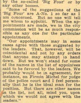 4 Three dismissals, three promotions and four reinstatements and two new hirings were announced yesterday by City Commissioner Henry Magin, director of public works. Dismissed were Eugeni Gatti, 208 Washington street; guilio marcozzi, 321 Line Street, and George Pollard, 336 Stevens street, all temporary laborers at $4 a day. James Carr, 1409 Princess avenue, a laborer on asphalt repairs at $6 a day, is reclassified as general foreman of the department, effective today, at $2100 a year, subject to Civil Service promotional examination. John Dziekanski, 1414 Mt. Ephraim avenue, a laborer in the building bureau at $6 a day, is reclassified as architectural draftsman at $2100, also subject to examination. Oscar Moore, 543 Washington street, Ninth Ward freeholder, will receive $6 instead of $5 a day as a temporary laborer. Reinstated were Lawrence Abbott, 910South Third Street, a brother of Frank Abbott, deputy to Mayor Brunner, as a temporary laborer at $5 a day; Anthony Carrier, 416 Benson Street, a temporary laborer at $4 a day; James Jackson, 1117 Lawrence street, and Otis Still, 261 North Eleventh street. All were discharged by Frank J. Hartmann, Magin's predecessor. |