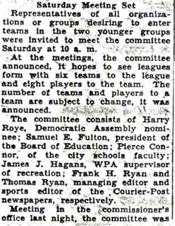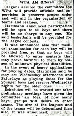 POYNT PLANS ALL-DAY 4TH PARTY Plans for the thirty-third anniversary of the Pyne Poynt Athletic Association to be observed with an all -day program at Pyne Poynt Park July 4 were discussed last night at a meeting in the Pyne Poynt Social Club, 929 North Fifth Street. Among the features tentatively planned are a children's parade at 9.30 a. m., under the supervision of Isaac Kyler; memorial service at 11 a. m., under direction of William B. Sullender; sporting events for men, women and children to start at 1.30 p. m., under direction of Alfred J. Ross, Jr.; outdoor motion pictures starting at 9 p. m., under supervision of Robert J. Nelson and a dance in charge of Samuel G. Dickinson, Jr., starting 11t 10.30 p. m. Committee chairmen chosen by Frank J. Hartmann, Jr., president, are: Grounds, Foster Willis; program, Otto E. Braun; police, Clifford Flennard; dancing, Samuel G. Dickinson, Jr.; first aid, Dr. Joseph E. Nowrey and William Hughes; transportation, Samuel J. Edwards; public speakers, William B. Sullender; motion pictures, Robert J. Nelson; decorations, Walter A. Reyno; sports, Alfred J. Ross, Jr.; ways and means, Frank J. Hartmann, Jr.; publicity, Walter S. Agin; parade marshal, Isaac Kyler; refreshments, George Washington Ash; light, William Hilton, and music, Frank Kelley. Children of the Sheltering Arms Home, Home for Friendless Children and the Detention Home will be guests of the association during the day. Samuel J. Edwards will be in charge of their entertainment. The association will meet again next Thursday night. |