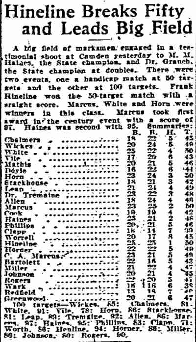 J. HINELINE DIES AT AGE OF 67 Frank J. Hineline, president of the Camden Lime Company, one of the leading Masons of the state and for years one of the best target shooters in the country, died early today at. his home on Chews Landing Road, Haddonfield. Mr. Hineline, who had been ill for more than two years of heart disease, was 67. Although in ill health for a long period, Hineline was not considered in a serious state until several weeks ago. He had been able to take care of some of his many business affairs, although his activities gradually lessened until he was forced to remain in bed. During the last two weeks his condition had been grave. When be died at 5:45 a.m. his wife, Mrs. Alberta Budd Hineline and his children, Frank B. Hineline and Mrs. Erma Bulkley, were at his bedside. Besides being president of the Camden Lime Company. Hineline was a director of the Camden Safe Deposit and Trust Company, a charter member of the Camden Club and a member of Camden Lodge of Elks. He was honorary president of John James Audubon Chapter of the Izaak Walton League, a member of the Camden Gun Club and many kindred outing organizations, for he was a great lover of the field and streams. Hineline was a member of Ionic Lodge, of F. and A. M., which he joined in 1902, of Siloam Chapter, R. A. M.; Cyrene Commandery, Knights Templar, of which he was commander In 1913-1914. He joined Excelsior Consistory in 1904 and was made a Thirty-third degree Mason at Boston in 1918. He was elected commander-in-chief of Excelsior Consistory, Ancient Accepted 8cottsh Rite Masons, in May of 1929, succeeding at the time Frank C. 8ayrs. He was also a member of Lulu Temple in Philadelphia. He founded the Camden Lime Company 37 years ago with an office on Federal Street below Second. At that time he had associated with him William Stone who retired about 10 years ago. Hineline then took over full control of the company which expanded, with two plants on Cooper River, one below Federal Street the other at the head of Pine Street. The office was located several years ago at 39 South Sixth Street where his son has been associated with him as a member of the firm. Noted Marksman For many years he was identified with the best target shooters in the country, being among the top notchers when it came to marksmanship. He not only participated in matches at weekly events hereabouts during his younger years but went to other cities in national and international tournaments. He was instrumental many times in bringing back trophies and himself had a great array of medals, cups and other evidences of his prowess with rifle or gun. Nothing satisfied him more in his active years than to get back of a dog in the open fields in gunning season or to cast a trout line at the opening of the season. It was his interest in the outdoors that made him the permanent honorary president of the Walton Leaguers. He likewise enjoyed golf. Hineline had been a resident of Camden since 1870 when he came here from Washington at the age of three years with his parents. He received his education in the old Liberty School at Eighth and Spruce Streets. Mrs. Hineline is the daughter of the late Isaac Budd, who was one of the early building material men of the city. Her brother, Hiram Budd, president of the City Line Lumber Company, died suddenly a few weeks ago at his home on Baird Avenue. |