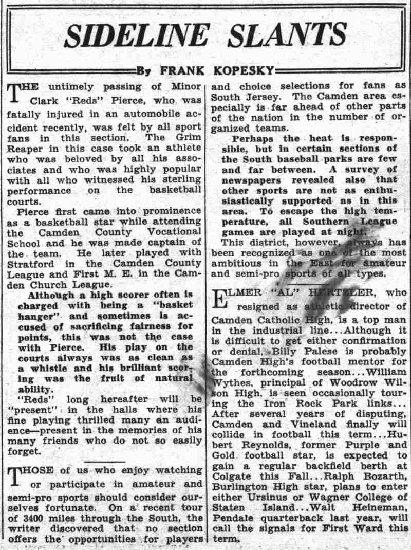 SLANTS LEROY "REDS" SMITH, astute coach of the Trenton High Bengals, will not tolerate dreaming when his club is in action, .. He called upon a sub in the fuss against Camden High, and when the player made a move towards the referee instead of reporting to the scorer, "Reds" immediately recalled him. It was his son… Jack Reynolds, of Haddonfield, former Cincinnati newspaperman, departed yesterday for Puerto Rico for a month's vacation with the Cincinnati Reds … Ralph Patterson, who starred for Pennsauken, and Claude Maxwell, of the Oaklyn Club, have been admitted to the Independent Umpires' Association. * * * Vince Zizac, Camden's contribution to the. wrestling fraternity, whacks the handball without gloves just as hard as the next player … The veteran Fergie McGrath uses special padding in practice, and "Dutch" Goodwin, former Pitman High athlete, wishes that the game were played with paddles … Phil Brooks, athletic director of Camden High, isn't a bit bashful. When he sends his swimming team through a workout at the Y. M. C. A. tank, Phil doffs his clothing and takes an active part in the proceedings. * * * BILL SCHULTZ Is one of the most accurate shooters on the Camden police force and is able to hit the bull's-eye almost at will … Mike Lynch, former Camden High and Celtics basketball star, has practically forsaken sports and spends most of his spare time coddling his year-old daughter, Catherine … Three brothers from Ocean City, John, Lon and Fenton Carey, are making athletic history at the University of Delaware … John swims, plays football and stars in track; Lon is also a gridder and runner, while Fenton plays baseball and tennis … Another Ocean City youth, Olaf Drozdov, is a football and track star at the same institution… Dr. William Scheffler, local medico, at one time held the German A.A.U. 50- and 100-meter swim records … Today, nearing his 50th milestone, "Doc" boasts a physique of a person half his age … Charley Rogers, erstwhile Camden High athlete and football coach at the University of Delaware, is a stock and bond salesman for a leading Philadelphia concern … Frank McFadden, former Camden Catholic High track star, is coaching his brothers, John and Paul who also are star runners at the local institution. * * * |