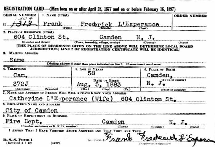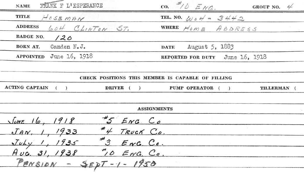 FRANK FREDERICK L'ESPERANCE was born in Camden NJ on August 5, 1883 to Frederick T. L'Esperance and Mary Stout L'Esperance. His WWI draft card states his name as "Frederick Franklin L'Esperance", while his WWII draft card and fire department records have his name as Frank Frederick L'Esperance. Frederick T. L'Esperance, was born around 1854 in Pennsylvania. He appears in the 1878-1879 City Directory at 606 North 5th Street with his widowed mother. The 1880 Census as living in Camden with widowed mother Elizabeth and a sister, Amelia, and working as a paperhanger. He married Mary Stout soon afterwards. The 1883-1884 City Directory shows the family at 510 North 3rd Street. Frederick T. L'Esperance appears in the Camden City Directories in the years 1885 through 1914 and in the 1900 Census as living at 540 South 6th Street in Camden, and worked as a paperhanger and on occasion as a clerk. Mary L'Esperance worked as a music teacher and later was involved in a grocery business. Frank L'Esperance married his wife Jennie around the turn of the century. In June of 1903 his first son LeRoy D. was born. Another son, Wendell B., was born in 1909. The 1906 City Directory shows Frank L'Esperance working as a painter and living at 545 South 6th Street, across the street from his parents where were still living at 540 South 6th Street. His father was still working as a paperhanger, and his mother Mary was partners in a grocery at 600 clinton street with Charles Hollenbaugh. The business was called, appropriately enough, L'Esperance & Hollenbaugh. Frank L'Esperance and family had moved to 738 Division Street by 1910. By 1918 they had moved to 541 Roberts Street. Frank L'Esperance joined the Camden Fire Department on June 6, 1918. He appears in the 1920 census as Frederick F. L'Esperance. He is then living at 541 Roberts Street. By April of 1930 he was renting a house at 606 Clinton Street in South Camden. Sadly by then he was a widower, Jennie L'Esperance having passed in 1929. Fire Department records from 1931 show him living at 632 Berkley Street. He remarried, and by 1947 was living at 604 Clinton Street. Frank L'Esperance served with the Engine Company Number 5 at 5th and Arch Streets and the Engine Company Number 3 before being assigned to the Engine Company Number 10 at Ninth Street and Morgan Boulevard in 1938, in the Fairview section of Camden NJ, where he served with Spencer Smith Sr.. Frank L'Esperance applied for his pension in July of 1950, a mandatory retirement at 65 law having been passed covering police and firemen. His last day on the fire department was August 31, 1950, when he retired along with Deputy Chief Clarence T. Madden Sr., Firemen John B. "Shorty" Prucella, and Fireman Spencer Smith Sr.. Frank L'Esperance passed away sometime between October of 1956 and October of 1959. He was survived by his second wife, Catherine, and his two sons, and grandchildren. |