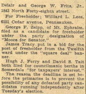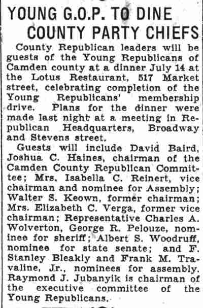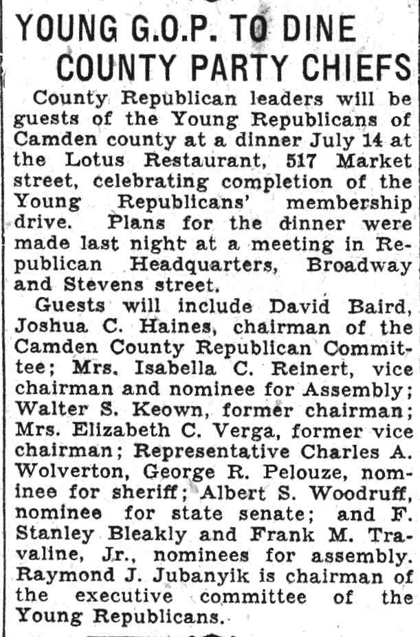 The way some of the members of the Camden County Republican Committee are behaving these days, the Democrats can stay home on their own meeting nights … The Republicans are doing their work for them … Now some 70 of the Republican committeemen have signed a petition to give Baird a job that won't pay him anything… It's about time they're giving him something … They took the U. S. Senatorship away from him … Moore took the governorship away from him … Woodruff took the state committeeship away from him … The New Deal took the city commission away from him … The New Deal took the freeholders away from him:.:. Somebody always is taking something away from Baird … It isn't a question of Baird's ability to fill the bridge job … The only one to even mention that as an issue was Fred von Nieda … He's a city commissioner, you know … It's a matter of principle … At least, that is what Florence Baker, state com-mitteewoman, says … Mrs. Baker is telling Senator, Clee and others at Trenton that they owe it to Baird to support him for the job because he has always helped Clee …Let's, in all fairness to Baird, look at the record … In the primary, during an address at the First Ward Republican Club, Dave Baird stated he was for Cliff Powell against Clee … Mrs. Baker did not come out against Clee … She didn't come out against Powell. Instead, she said she was neutral. In the general election, Mrs. Baker said she was for Clee. Baird never said he was for Clee. (If he had, Clee's majority of 35,000 would have gone to Moore) … So we don't think that Mrs. Baker is very convincing when she tells Clee that baird helped Clee … She said that the Camden county legislative delegation helped Clee's program against Hoffman. Was baird a Democrat last year? Sheehan, Roye and Lodge were … Burling was a Republican, and helped Clee, but he is not for baird. Perhaps it was because baird "helped" Clee's program against Hoffman opposition, that Hoffman slipped in baird's appointment without the knowledge of Burling or the state or county committee members … Mrs. Baker stated at a banquet that she has copies of the Courier-Post in 1931 in which baird was praised for his bridge work … If anyone cares to look at our files, we will show what Mrs. Baker said about baird in the neighborhood of 1931. … Or what we said about baird at other times … Also what Mr. van Nieda and Frank Travaline said. But enough ado about nothing … All we've done is talked about baird when it had been our plan instead to talk about politics. * * * The political ax is hanging over the head of a Mt. Ephraim official on the charge he is assuming too much authority … The political ax hanging over the heads of the Delaware township cops is about to be enmeshed in litigation … One of the policeman is a member of the P.B.A. which will carry his fight into court in a case that will be a precedent for the other township cops, too … Herb Taylor will be county engineer if it goes to a Republican … It may be a Democrat however, and newest among the candidates, on that side of the ledger is former City Commissioner Carroll P. Sherwood … There may be only one assistant county solicitor instead of two in which case it will probably go to Carleton Rowand, city school board member … By the way, don't, be surprised if under the new contract between the city and county on maintenance of the City Hall, the city takes full control of the building with consent of the county … Which will be tough on some of the county jobholders …* * *. Assemblyman Allen now denies he wants all us newspaper fellers to go to the guillotine … He says he meant lawyers … Charlie Humes wants to be guillotined … Standing up … Incidentally, Charlie is defending his last-place position in the ping-pong league tonight… Firefighter Lennox went to church the other day… And found the roof braced up. When will the borough of Merchantville fix up that dangerous hole in Browning road at the railroad tracks north of Maple Avenue? … Or is that in the township? Whenever the state police want Detective Wojtkowiak at the prosecutor's office, ·they ask for "Sergeant Watchyourcoatandhat" … The Mt. Ephraim commissioners are going to buy a police car for their chief … He's also in for a pay rise … Bellmawr's chief of police won't get the salary increase he wants, but he will get an additional allowance for the use of his car … Runnemede's two new cops will also get pay increases … The other day an alarm was sent to every police department in the county and also to the Philadelphia cops that a car had been stolen in Audubon … The culprit is glad no cops saw him … He was none other than a police official who wanted to borrow a storekeeper's car but took the wrong one by mistake … His face is almost as red as Vince (deP) Costello's … At the K. of C. roller skating exhibition the other night, Luke McKenna did a few fancy turns … Vince recalled he, too, had been pretty good at one time, so he essayed to show his friends … His intentions were better than his legs, and a couple of well--wishers followed him around the floor with a stretcher. This all happened quietly The Runnemede police received a complaint from two storekeepers … It appears that a group of high school students from another town had stopped off at Runnemede to purchase some cakes … Several other articles disappeared from the stores ... A few days later the dean of the high school went to Runnemede paid one shopkeeper $10 and the other $2.60 ... Representing the goods they said were taken ... Aside to that clairvoyant weakly editor who reported yesterday that Joe Van Meter is going to be the Republican nominee for sheriff: A sheriff cannot succeed himself in New Jersey ... Silvio Fittipaldi, former Haddon Heights High star, is a veterinarian and doing nicely ... A Philadelphia college professor who lives in Pennsauken uses his spare time writing a 
