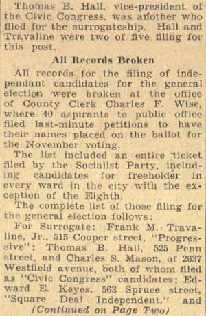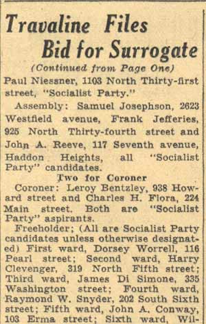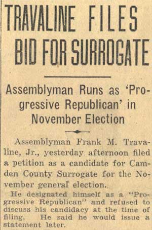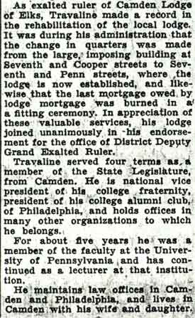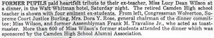 Assemblyman Frank M. Travaline, Jr. commented on the passing of Clara S. Burrough, long-time principal of Camden High School: "She was the most valuable public servant we ever had. She was a good disciplinarian and had a broad view of education. She tried to understand the problems of the pupils, parents and board of education. The high standard of the Camden school system and its high rating are attributable to her efforts. Camden has suffered a distinct loss." |