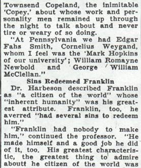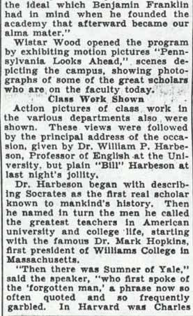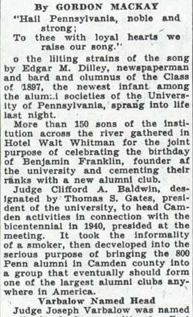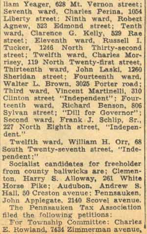 Walter E. Edge of Atlantic City, former U. S. senator and former ambassador to France. is going to build a large home in Haddonfield … Incidentally. the city made one economy move that is costing dough-de-oh-dough … We refere to that day three months ago when nearly all the offices in the city hall were deprived of paper towels … For now the municipal employes are using other paper and three times as much of it as they formerly used of towels … So that the city has to spend more than it saves … This week we heard one of the most ironical paragraphs of the year…Or any year for that matter. In a certain municipality (you guess) a man works for the relief committee doing odd jobs here and there .. He gets a salary of $6 a week (believe it or not, Mr. Ripley) … So a couple days ago he asked his boss, who was the relief director, for some relief for himself, as he was hungry and didn't get enough money to buy meals regularly, let alone buy clothing .. So what do you think happened? .. Sure … He was turned down … That pest (the one who used to claim he was Commander John D. Pennington's bodyguard) now says he has been selected as deputy U. S. marshal for this district to fill the vacancy caused by Paul McLaughlin's resignation … By the bye, what former federal employee runs a whisper-low in Philadelphia and did so even when he worked for the government? .. It is, however, a respectable, or as respectable as speaks can be. Why, every time it rains, is the rondpoint at the airport flooded? There's the reader who asks us to warn that suburban cop … Who has been cheating for three years with a "Wrong Number, Sir" gal .. To his children, however, he is an idol. .. That South Jersey feller who shot his woman companion and then killed himself recently … Both were buried in the same grave … By his wife … Because the dead woman's relatives couldn't be found and the widow wanted her to have a Christian burial … So orchids to her … And, incidentally. the reports that he had filed divorce papers were erroneous … The wife had filed suit … Assemblyman Frank M. Travaline Jr., who forgot to duck up in the senate cham bers not so long ago, is going to be married July 1. .. And on that same day a certain radio station attache and a Parkside girl are planning to surprise all their friends by getting married in New York … Ooooh, the big tattle-tale … But if you only knew who told us about it. … He at tended Camden High School … The bride-to-be attended Camden Catholic High … That young local attorney accused of tipping off some prisoners that a news cameraman was going to photograph them and who also is alleged to have threatened to break the camera denies it all … He says it was a cop who did all that. .. So that's that. . |