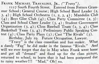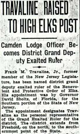 FRANK MICHAEL TRAVALINE JR. was born July 19, 1899, the son of Frank and Antoinette Travaline. The Travaline family lived at 1117 South 4th Street in South Camden, between Chestnut and Sycamore Streets. A 1919 graduate of Camden High School, where he was a student of Lucy Dean Wilson, Frank Travaline Jr. went to college, and then studied law, graduating in 1926 from the University of Pennsylvania Law School. He was practicing law in Camden and living with his parents, brother Dominic, and sister Nan at the time of the 1930 census at 1117 south 4th street. Frank Travaline practiced in Camden and Philadelphia for many years. He was a four-term New Jersey State Assemblyman in the 1930s, and ran for the office of Camden County Surrogate in 1934. An accomplished musician, Frank M. Travaline Jr. played trumpet with the Winegar Orchestra in New York, the Howard Lanin Orchestra and the Meyer Davis Orchestra. Another young musician who appeared with Howard Lanin was violinist Louis Feinberg, better known as Larry Fine of the Three Stooges. Hi brother, Dominic "Don" Travaline, was a professional musician, songwriter, and composer. Frank M. Travaline Jr. married Winifred S. McHugh, and the Travaline family eventually included several children. He was an active member of the Elks, served as Exalted Ruler of the Camden Lodge, and in higher posts in the Elks organization. He also taught at the University of Pennsylvania for five years. Frank M. Travaline Jr. last lived in Woodbury Heights NJ. He passed away December 15, 1999 at the age of 100. He was survived five children, Sr. Patricia A. Travaline, MMS, Philip F. Travaline, Richard J. Travaline, Mary Ellen Krucz & Frank M. Travaline III; 10 grandchildren and 5 great-grandchildren. Frank M. Traveline Jr. was buried at Lakeview Memorial Park, Cinnaminson, NJ. |