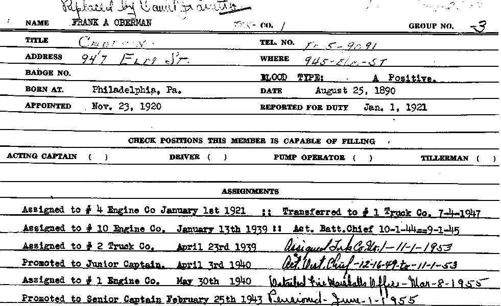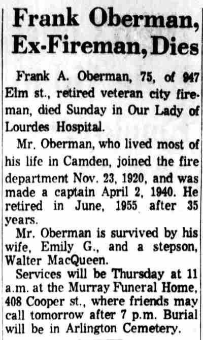 According to the 1920 Census, he worked as a "machine hand" at the Victor Talking Machine Co. factory in Camden before going to work as a fire fighter. He was appointed to the Camden Fire Department on November 23, 1920, and reported for duty on January 1, 1921 with Engine Company 4. He was serving with Engine Company 10 when promoted to Junior Captain in 1940, and with Engine Company 1 when promoted to Senior Captain in February of 1943. From October 1, 1944 through September 1, 1945 Frank Oberman worked as Acting Battalion Chief, and from December 16, 1949 through November 1, 1953 he served as Acting District Chief. He was transferred to the Fire Marshal's office on March 1, 1955 and retired on June 1, 1955. Frank A. Oberman Lived out his days at 947 Elm Street. He died in March of 1965, survived by his wife, Emily G. Oberman, and a stepson, Walter McQueen.