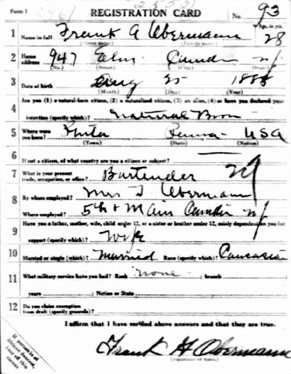 By 1906 the Obermans had moved to 505 Main Street in North Camden where they operated a bar that would come to be known as the Main Cafe. The bar was still in the family's hands as late as 1947. Frank Oberman worked in the family business as a bartender as late as June of 1917, when he registered for the draft..