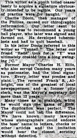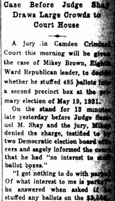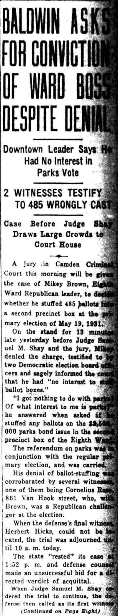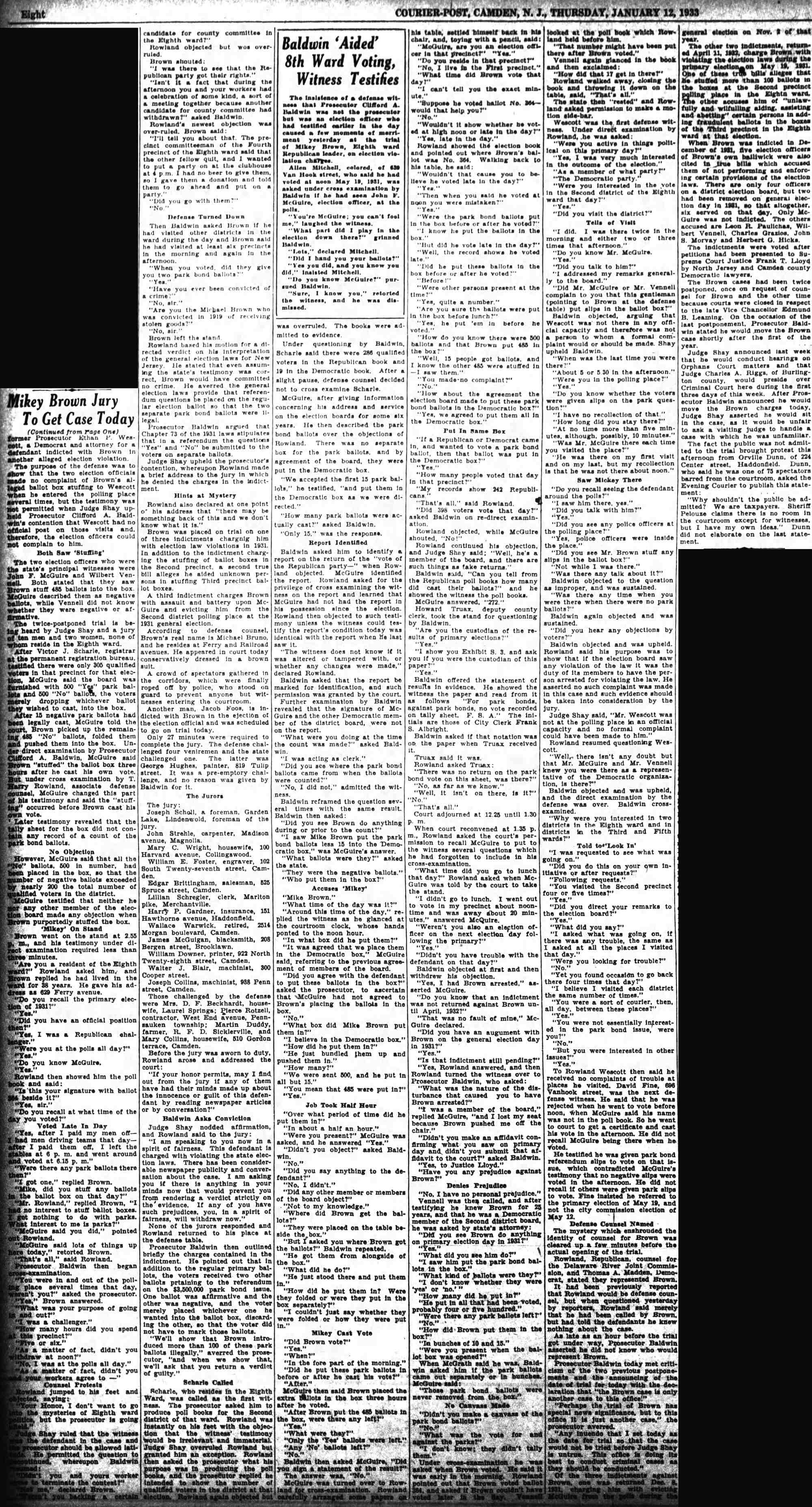 Brown Says Jury Has Plenty To Probe In Eighth Ward Voting "The prosecutor and the grand jury have plenty to investigate in this ward concerning the last primary election." mikey brown , central figure in many Eighth Ward election squabbles and thrice accused in election irregularities, had that to say yesterday when informed that Prosecutor Clifford A. Baldwin and the April grand jury is investigating al-leged ballot box stuffing in the ward at the last primary, May 16. Disclosure of ballot box stuffing in the Fifth precinct of the ward, which the prosecutor said he asked the grand jury investigate was followed by reports yesterday that similar irregularities prevailed in the First precinct at the primary, and possibly in other districts. Reports Checked In extending his probe of ward political conditions, Baldwin said he is checking reports that a brown challenger at the May election had refused to let the First precinct election board count what he declared were "stuffed ballots." The challenger is reported at close of the polling place to have said as he lifted a ballot box for the election board and spectators to see: "There are ballots in this box that don't belong there. They cannot be counted. I won't permit it. And remember, mikey brown didn't stuff this box today, as he had been accused falsely of doing at previous elections. mikey wasn't in this poll-ing place, so you can't blame him," brown had been three times in Camden County Criminal Court for ballot box stuffing and other alleged election irregularities. He was exonerated twice, and there was a disagreement in the jury in the third case. At the May primary, he opposed Edmund A. Walsh in a contest for Republican county committeeman from the Eighth ward, but was defeated. Walsh was re-elected. Asked what he knew about the latest Eighth ward situation, brown said: "All I can say is that the prosecutor and the grand jury will have plenty to investigate pertaining to the May 16 primary in the ward." Box Not Impounded The first precinct ballot box has not been impounded by City Clerk Frank S. Albright, as was the case of the box of the fifth precinct. Baldwin said he was checking rumors one of the first precinct boxes contained about 50 or 60 stuffed ballots. Baldwin said that if the situation be found by him to be as reported, he will request the grand jury to summon witnesses. Baldwin said he also is checking reports that the names of dead persons were "voted" at the ward primary. |