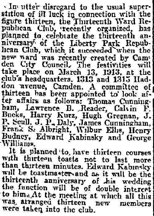 - Calvin F. Bucks - Harry Kurz - Hugh Greenan - J.P. Scull J.P. Daly - James Cunningham - Frank S. Albright - Wilbur Ellis - Henry Budney - Edward Kabinsky George Williams - Liberty Park Republican Club |