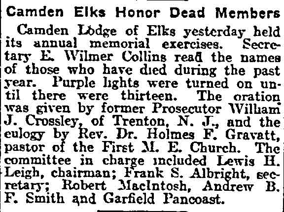 E. Wilmer Collins - William Crossley - Rev. Holmes F. Gravatt First Methodist Episocopal Church - Lewis H. Leigh Frank S. Albright - Robert MacIntosh - Garfield S. Pancoast Andrew B.F. Smith - Camden Elks Lodge 293 |