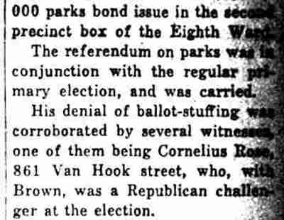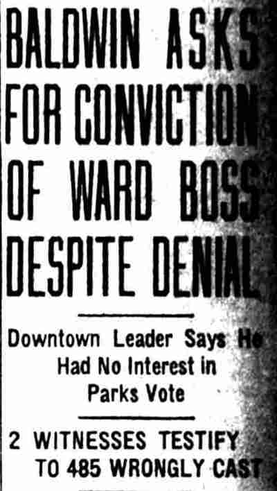STUFFING Another investigation into the mysteries of Eighth Ward elections was begun yesterday when the April grand jury probed ballot-box stuffing in the Fifth District at the May 16 primary. Prosecutor Clifford A. Baldwin requested the investigation after he "couldn't make head nor tail" of the fact that 25 ballots remained in the box even after 232 Republican ballots the number of persons of that party recorded as voting had been counted. Although unconfirmed, it was declared that all of the ballots were marked for Edmund A. Walsh, incumbent, who defeated mikey brown for election to the G. O. P. Committee. It is understood the prosecutor pointed out that the ballots were in bundles of five or six, and apparently had not been cast singly. Baldwin learned that the extra ballots were not counted by the election board, each member of which was called to the grand jury room yesterday afternoon. All expressed ignorance of how the ballots could have been placed in the box, it is understood. When Baldwin was informed of the mystery he personally inspected the box, which has been impounded in the office of City Clerk Frank S. Albright. "I couldn't make head nor tail of it, so I presented the case to the grand jury," Baldwin said. He refused to comment further. |